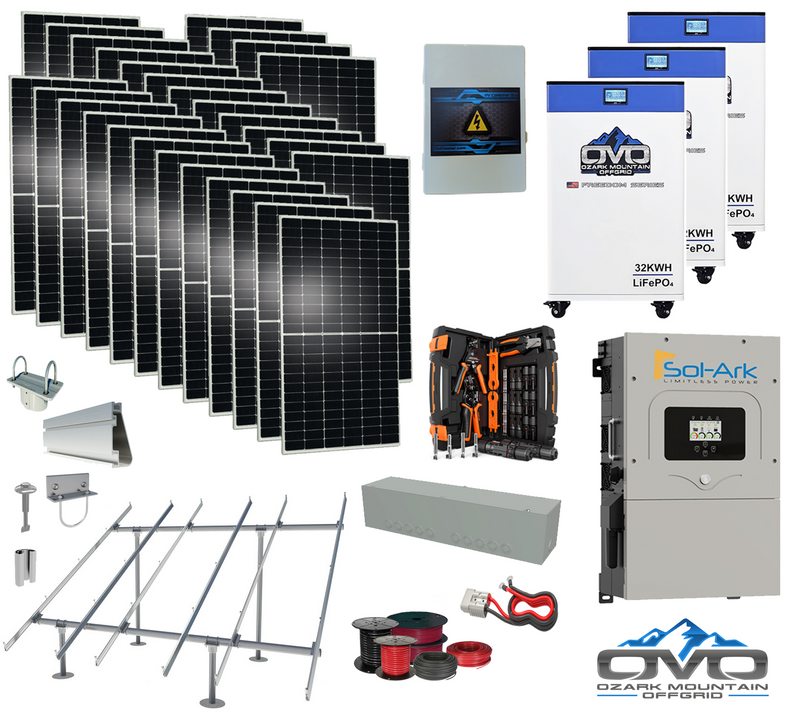15KW Complete Offgrid Solar Kit - 3x 32kWh OMO 48V Freedom Series Lithium Battery + 15K Sol-Ark Inverter +15.4KW Solar with Ground Mount and Wiring