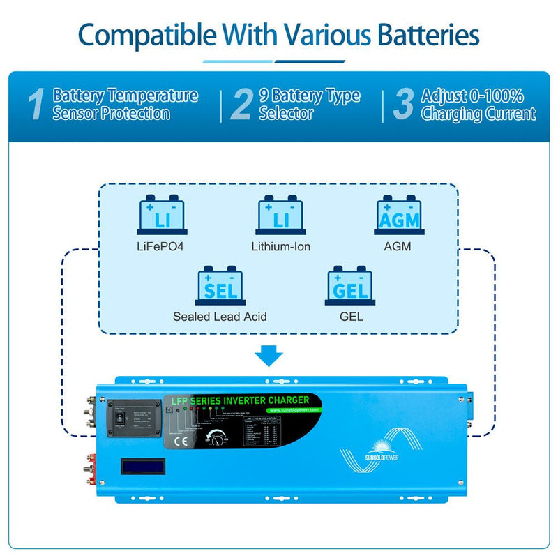 - ★ This LFP Series pure sine wave inverter 3000w/ 2000w/ 4000w is a combination of an inverter, battery charger, and AC auto-transfer switch. Low frequency, low Idle Current, BTS cable, remote control.