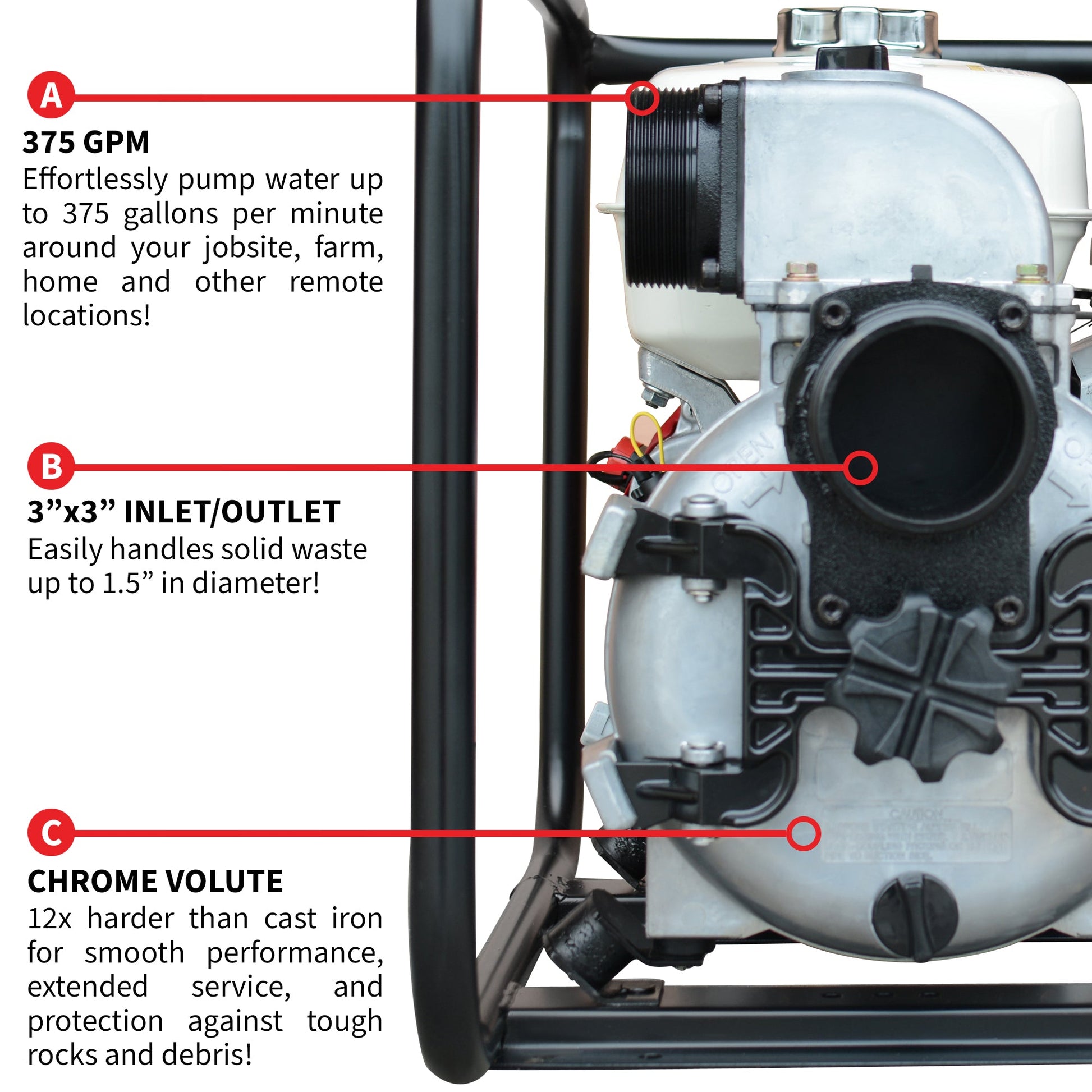 3 Inch Trash Water Pump 375 GPM 8 HP GX270 powered by Honda Portable Utility (SC)