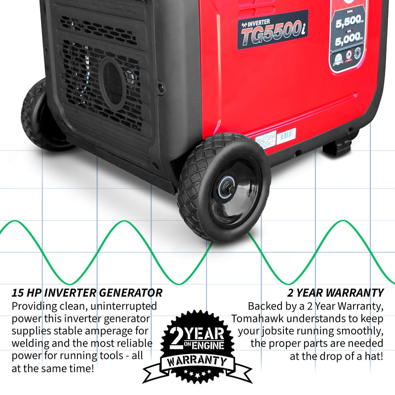 Tomahawk TG5500i Inverter Generators are built for the professionals who tackle the toughest jobs. Delivering a powerful 5500 Watts, this generator is your reliable partner for demanding job sites and remote operations. With an electric start for quick ignition and a high-performance engine, it guarantees consistent, robust power. Featuring advanced inverter technology, the TG5500i ensures clean, stable power, while its super quiet operation and eco mode maximize fuel efficiency and reduce noise. Compact and lightweight with an ergonomic handle, it's easy to transport, and its parallel capability means you can double your power when you need it most. Safety features like GFCI outlets, overload protection, and low oil shutdown keep you and your equipment safe. Backed by a solid 2-year warranty and supported by Tomahawk’s nationwide service centers, the TG5500i is built to deliver top-notch performance, job after job.