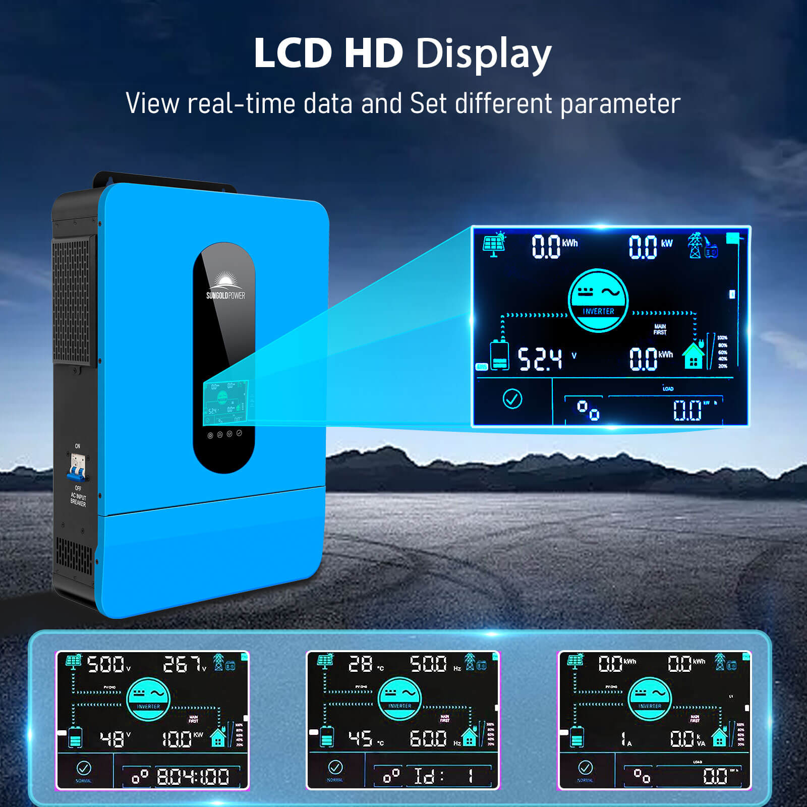 - ★ Stable AC output and Smart Protection: Rated Output Power: 6500W, Max Peak Power: 13,000VA, PV input over-voltage/current protection, AC input over-voltage protection, Battery over-voltage protection, Over-load protection and so on.
