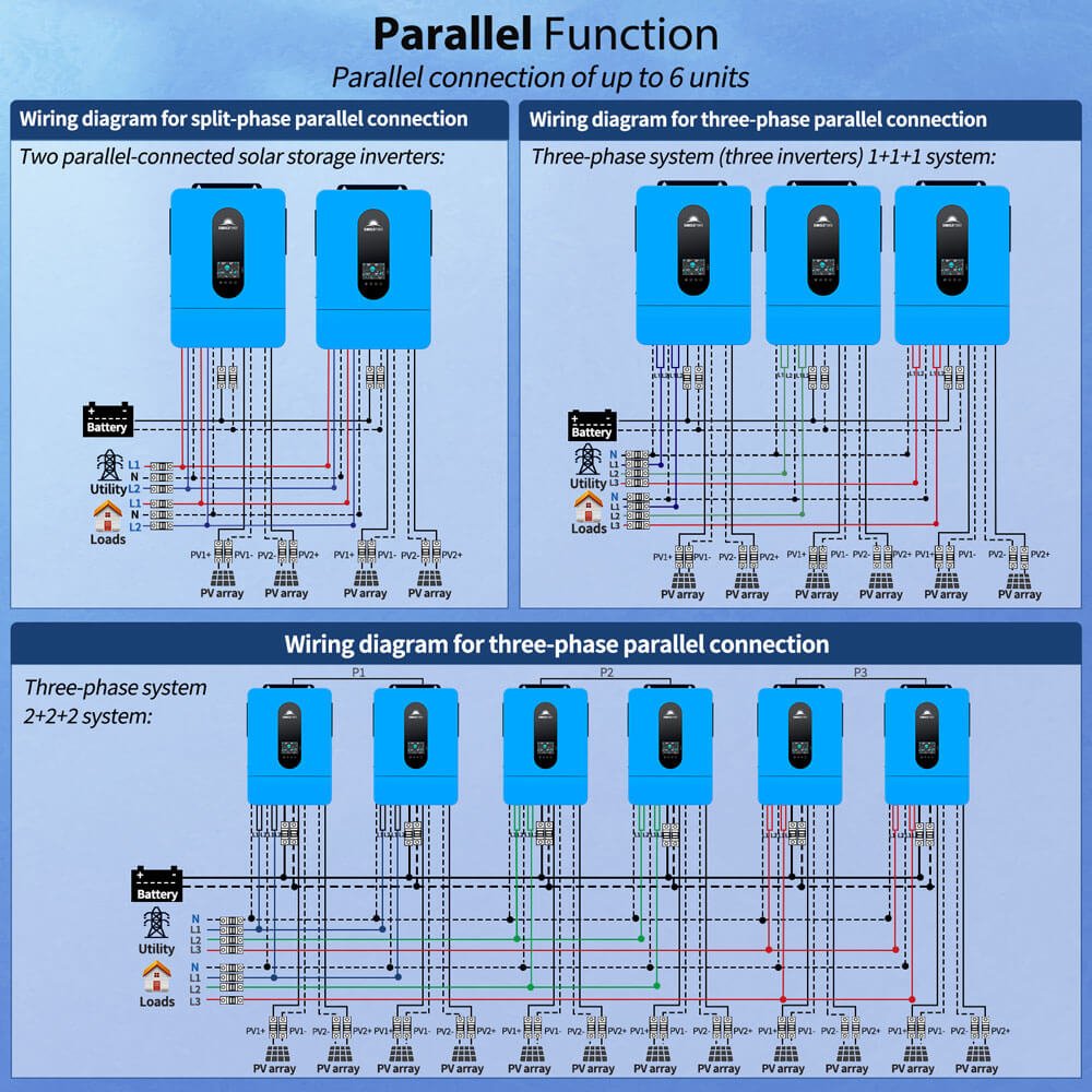 - ★ Parallel Kit: Parallel 6 units up to 39KW power output, you will get 120V single phase / 120V/240V Split Phase or 208V 3-Phase Support (more than 3 unit in parallel), increases the inverter power and surge capacity.