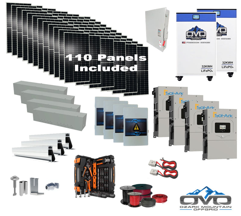 60KW Complete Offgrid Solar Kit + 4x 15K Sol-Ark Inverter + 2x 32kWh OMO 48V Freedom Series Lithium Battery +60.5KW Solar with Roof Mount and Wiring