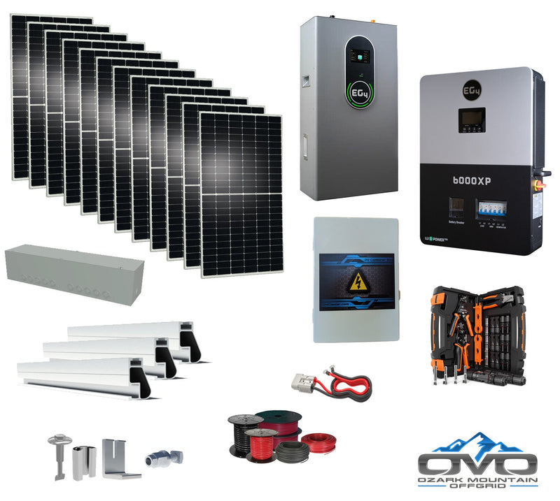 6.6KW Complete Offgrid Solar Kit + 6K EG4 6000XP Inverter + 14.3KW 48V EG4 Lithium Indoor Wall Battery + 6.6KW Solar with Roof Mounting Rails and Wiring
