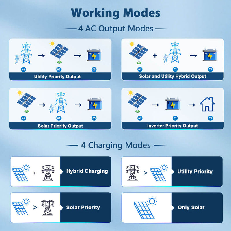 - ★ Four charging / Output modes: Hybrid Charging / Utility Priority Charging / Solar Priority Charging / Only Solar Charging, 4 output modes: Utility Priority / Solar and Utility Hybrid / Solar Priority / Inverter Priority to meet your different requirements.