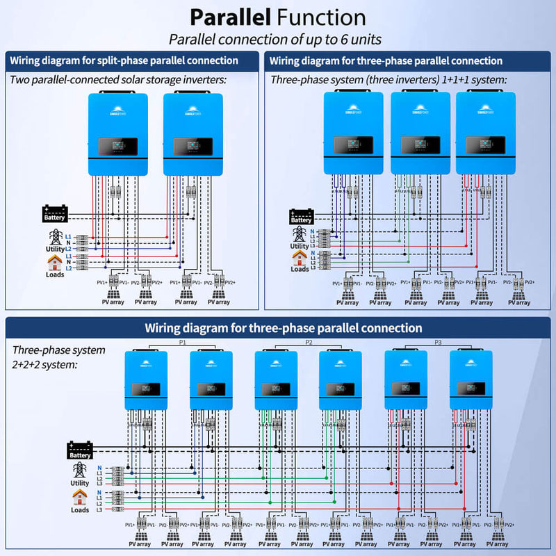 - ★ Parallel Kit: Parallel 6 units up to 48kw power output, you will get 120V single phase / 120V/240V Split Phase or 208V 3-Phase Support (more than 3 unit in parallel), increases the inverter power and surge capacity.