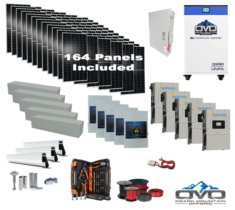 90KW Complete Offgrid Solar Kit + 5x 15K Sol-Ark Inverter + 32kWh OMO 48V Freedom Series Lithium Battery +90.2KW Solar with Roof Mount and Wiring