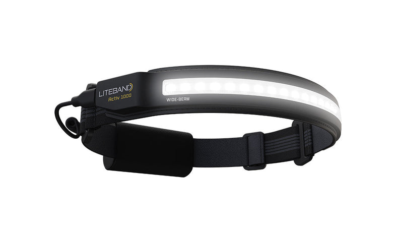 Liteband® ACTIV 1000 LED headlamp features the first 210° wide beam, low-profile headband style headlamp. Lightweight with an adjustable strap, Litebands provide long-lasting comfort for all day wear. The headlamp delivers 1000 lumens of ultra bright light, with a 1800 mAh lithium-ion USB-C rechargeable battery, and 32 hours of light on low setting. Featuring 5 light modes including high, med, low, red & pulse for maximum versatility. With a weatherproof rating of IPX 4, the Activ 1000 is perfect for camping, hiking, running, fishing and other outdoor activities. Professionals will enjoy the lightweight adjustable fit for hard hats & helmets.
