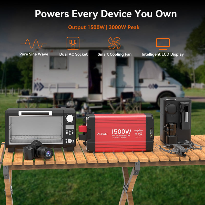 ALLWEI 12V to 120V pure sine wave inverter provides 1500W continuous power and 3000W peak surge with over 92% efficiency. The durable aluminum case withstands harsh conditions. Specs: 5.95 lb, operating range: 14°F–104°F.