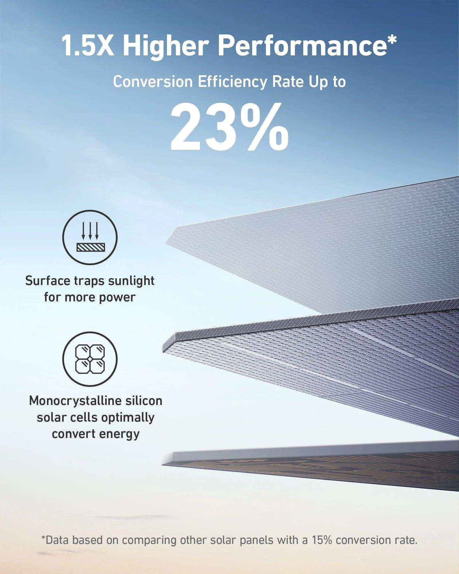 1.5X Higher Energy Conversion Efficiency: Monocrystalline solar cells and a powerful sunlight-trapping surface provide a conversion efficiency rate up to 23%.