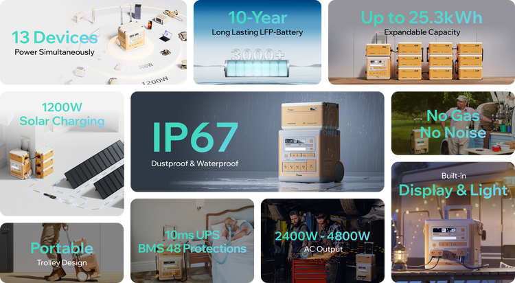 • Expandable to 25.3kWh: Scale your power needs with ease by connecting up to 10 extra batteries. It perfects for long-term off-grid living, or extended expeditions.
