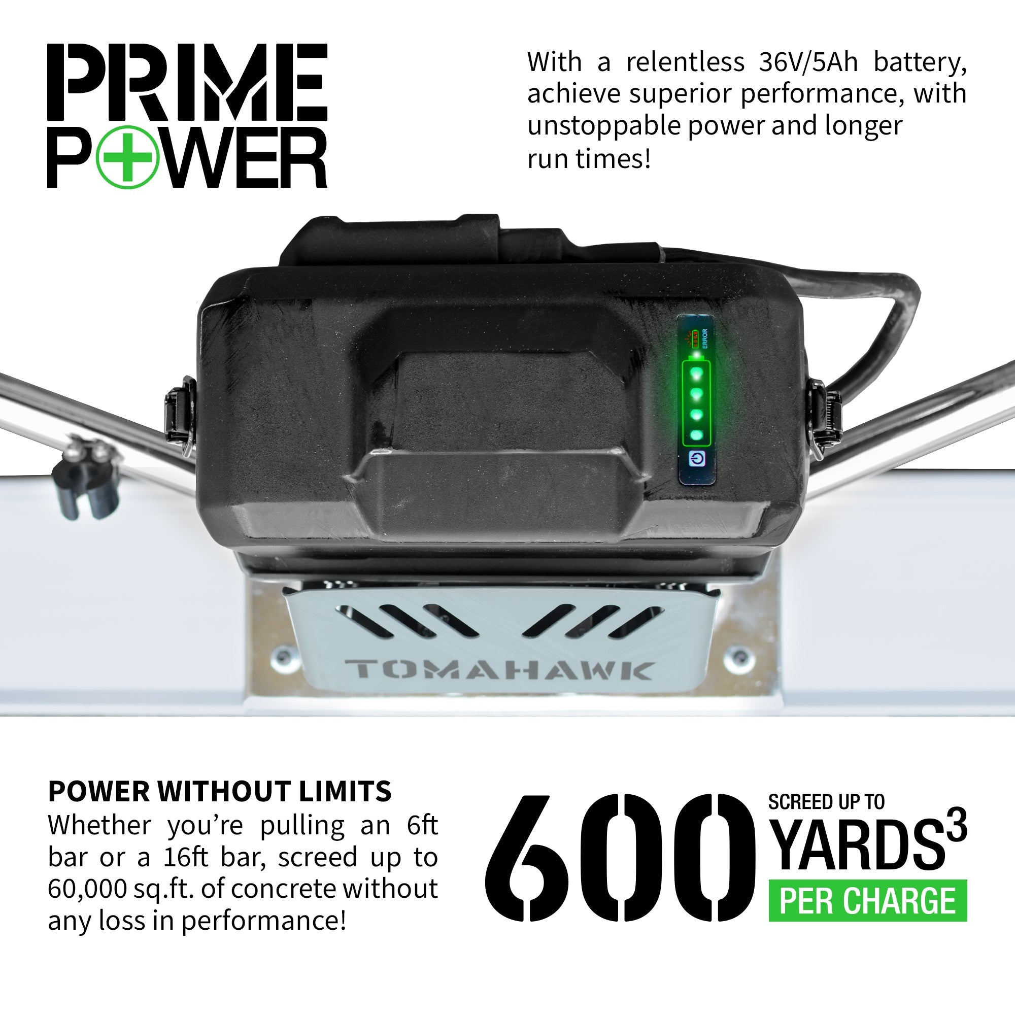The Tomahawk Patented Battery Screed is powered by a relentless 36 Volt / 5 amp Hour battery, easily pour 600 cubic yards of concrete with enough power to keep the trucks coming!