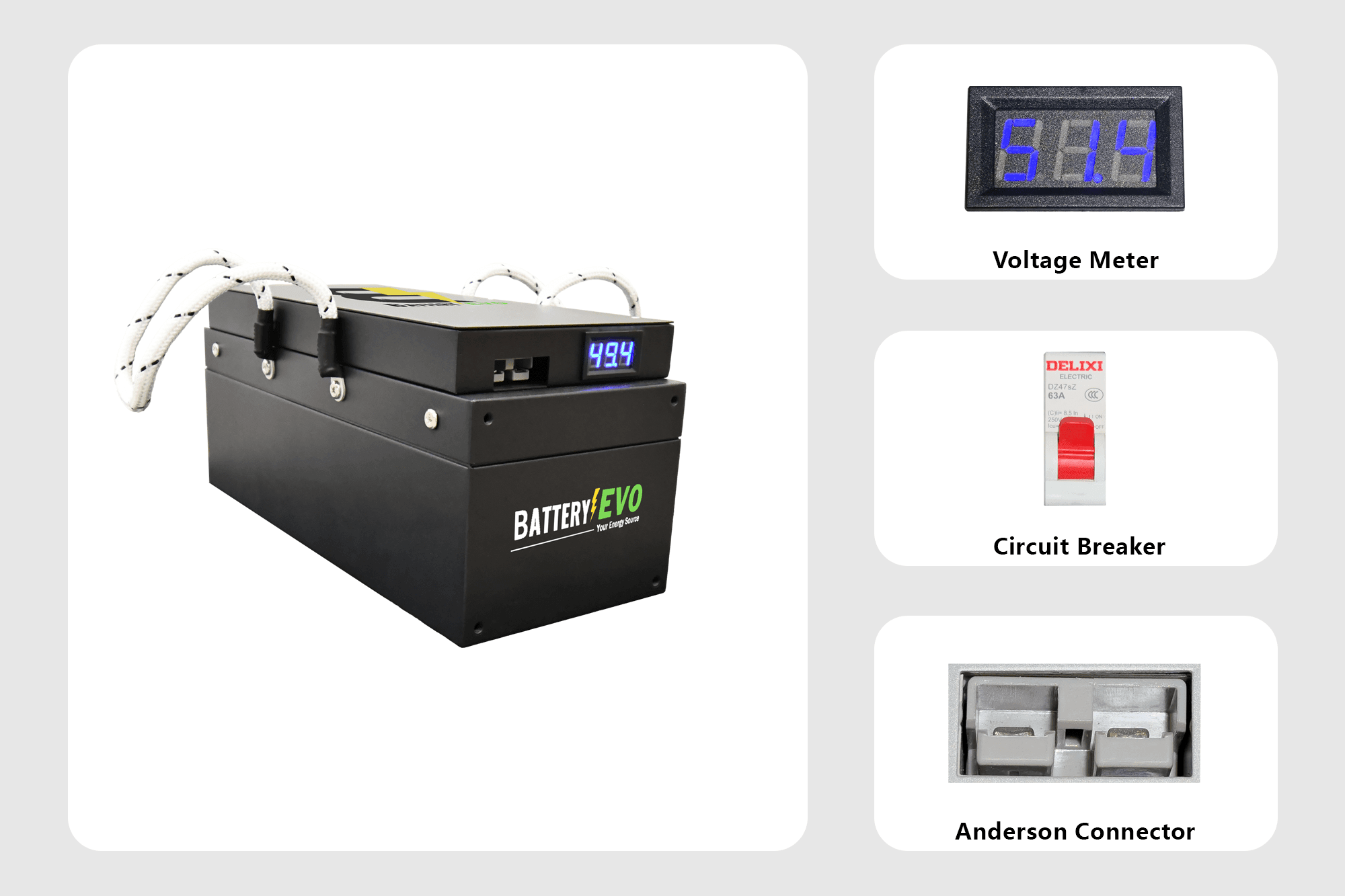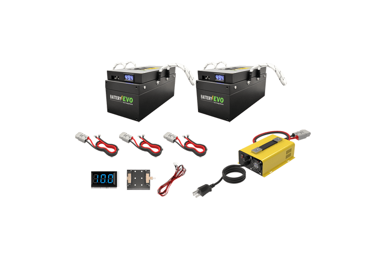 Introducing the BatteryEVO 48V BADGER 2x Battery Kit, the ultimate compact solution for powering your golf cart like never before! Engineered with cutting-edge technology, this battery kit offers remarkable reliability, efficiency, and an impressive capacity of 4.2 kWh to keep your adventures going strong. Don't let its lightweight design fool you; the BADGER is built with high-quality lithium-ion cells, a robust 63A Safety Breaker, and an advanced Battery Management System (BMS) with Thermal Management to ensure optimal performance and safety at all times.