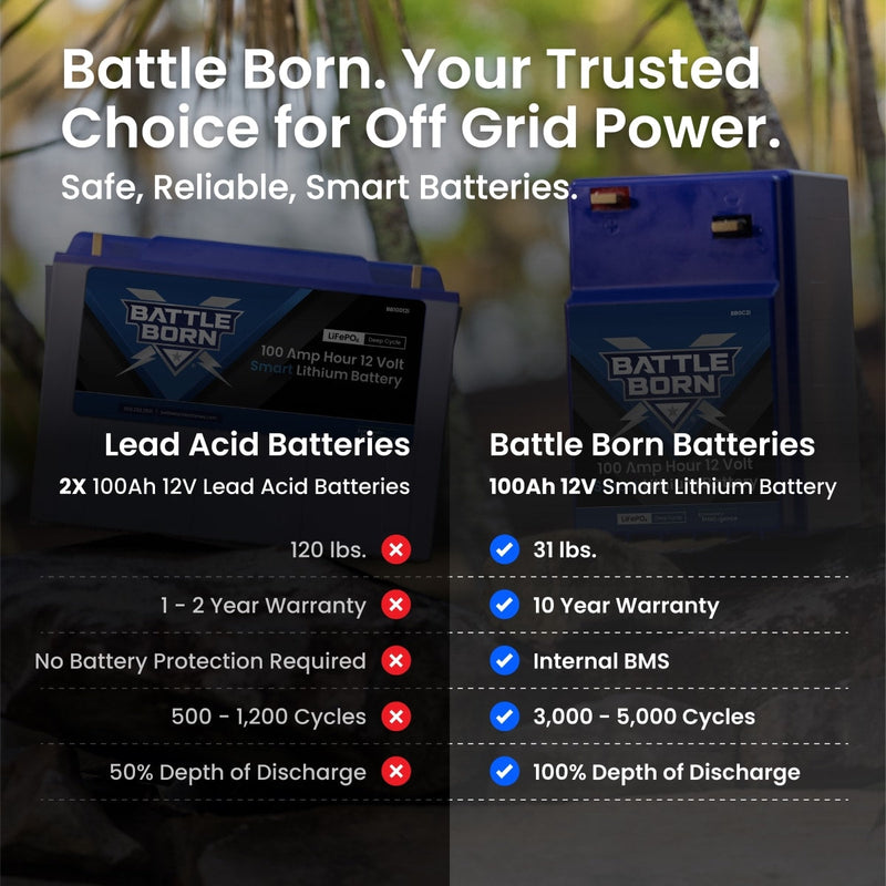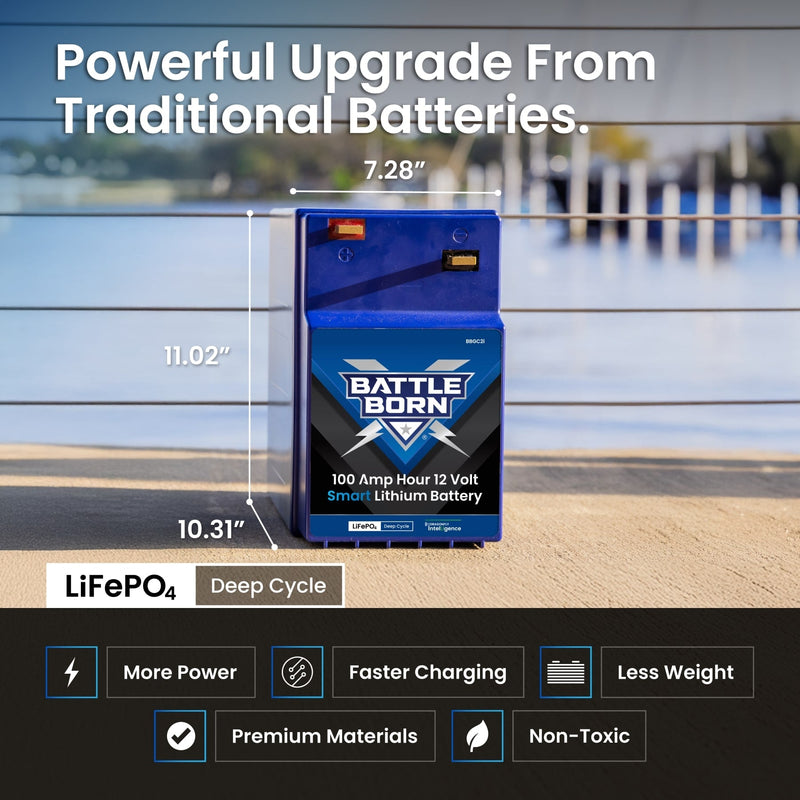 This powerful 100Ah 12V GC2 Smart LiFePO4 Deep Cycle Battery is a safe, reliable, long-lasting, and intelligent energy storage solution designed to elevate any outdoor adventure. Offering all the same benefits Battle Born® lithium battery users have trusted for nearly a decade, this Battle Born 100Ah 12V GC2 Smart Battery features smart battery technology that opens the doors to full power system connectivity, communication, and safety.