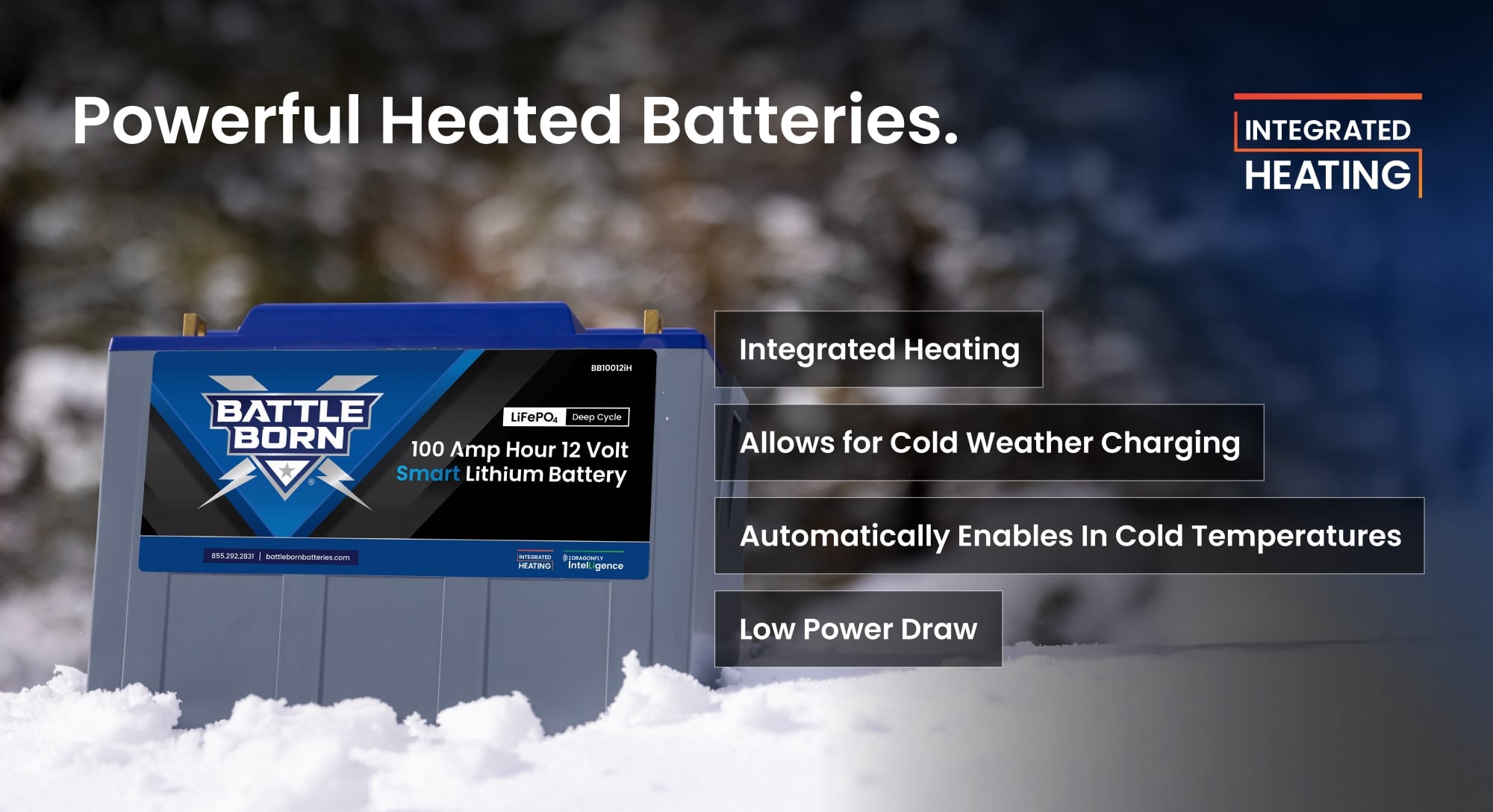 The 100Ah 12V Smart Heated LiFePO4 Deep Cycle Battery Kit delivers safe, reliable, long-lasting, and intelligent power – no matter the weather you might face. Equipped with a proprietary, low draw Integrated Heating technology, this smart battery is ready to charge and provide superior power, even in cold temperatures.
