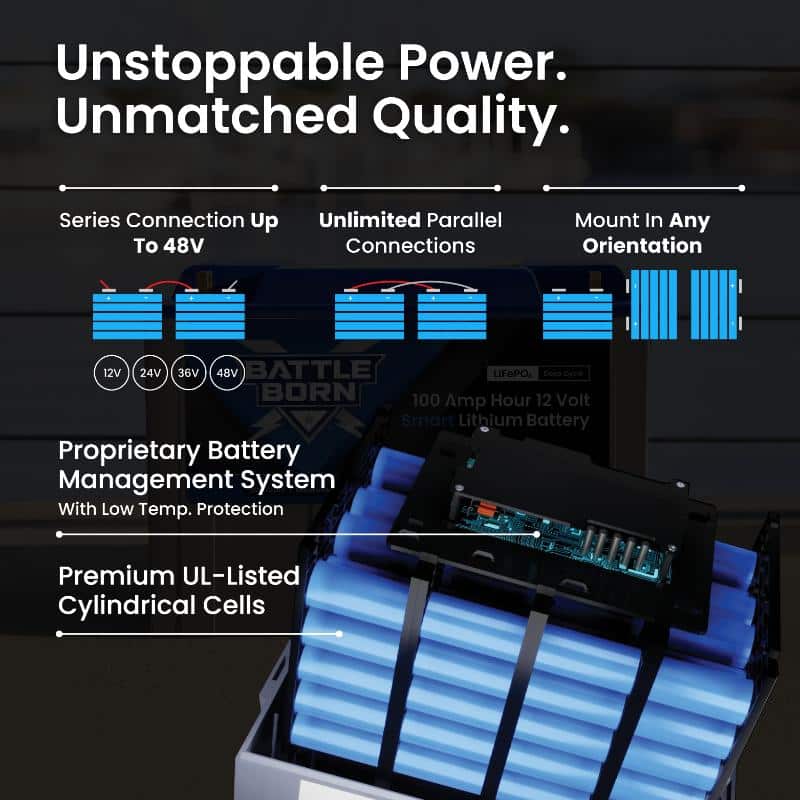 - Designed for Versatility with series or parallel wiring, any orientation mounting, and use in various RV, marine, industrial, and off-grid applications