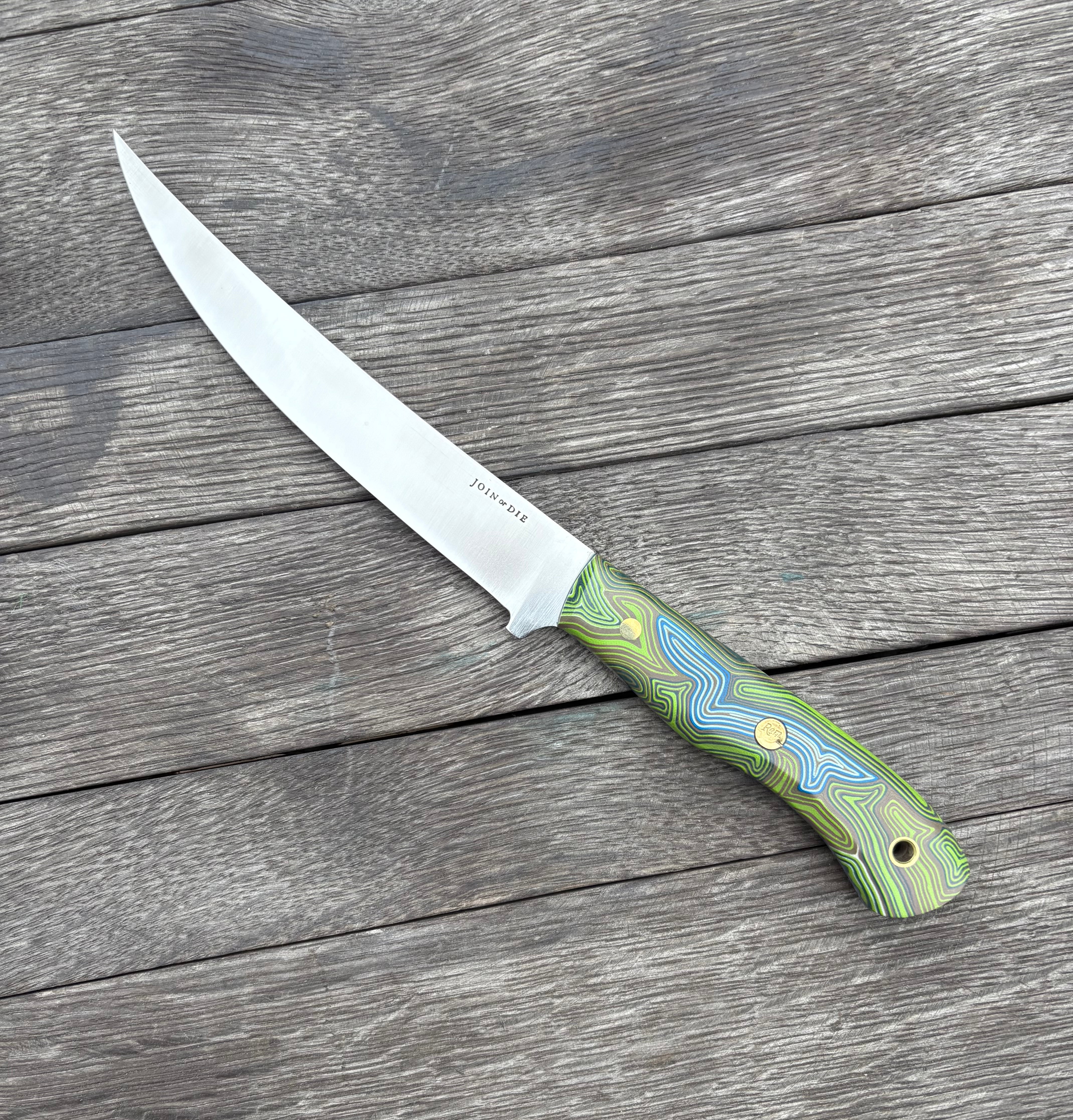 This 6” blade boning knife has just the right balance between stiffness and flexibility while retaining the same full hardness of all our chef knives. Made from Nitro-V stainless steel, the Pure White Corian and Black micarta pins make up the handle. Kydex blade guard included.