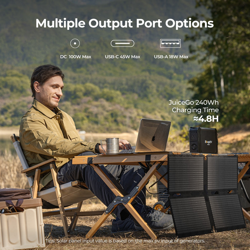BougeRV 100-watt portable solar panel is the perfect solution for off-grid power needs. Compact and lightweight, it delivers reliable energy for camping, RVs, boats, or outdoor activities. With easy setup and a foldable design, it's convenient to transport and store, providing clean, renewable energy wherever you go.