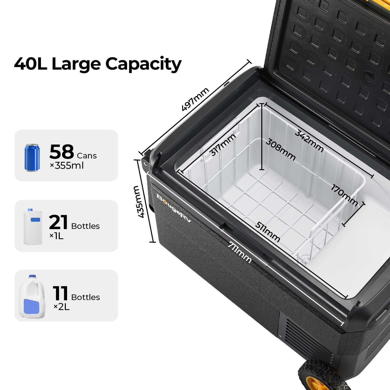 BougeRV CRS 42QT 12 Volt portable car fridge is your ideal car freezer and camping fridge, offering -20°C to 20°C adjustable cooling. With a 40L large capacity (fits 58 cans), it cools in just 15 minutes thanks to a powerful compressor. Enjoy ultra-quiet 35dB operation, smart APP control, and easy mobility with a built-in handle and wheels. This 12 Volt portable fridge is perfect for RVs, trucks, SUVs, and outdoor adventures.