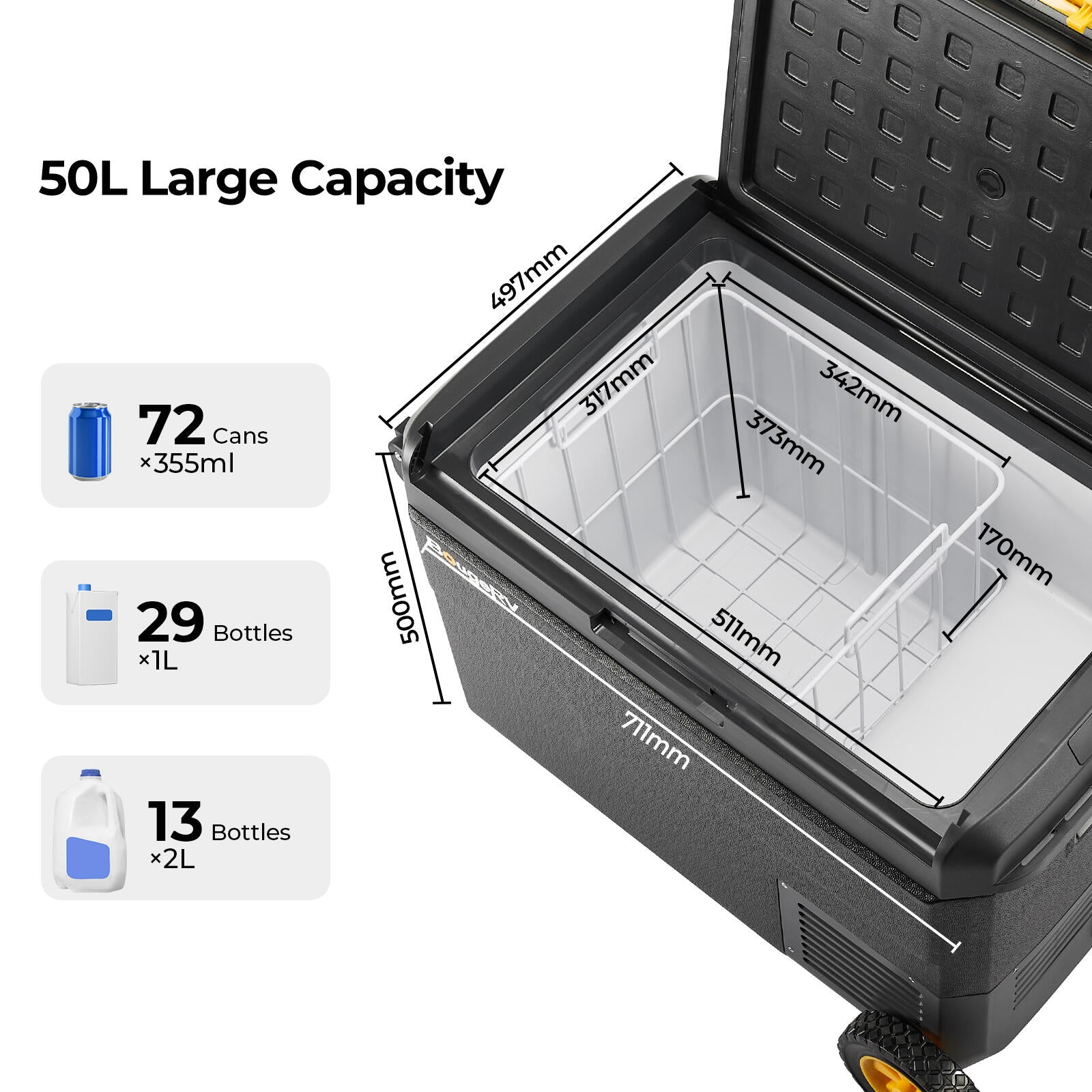 BougeRV CRS 53QT 12V RV fridge is the perfect companion for RVers, overlanders, and campers. This versatile 12 volt fridge for RV can function as a fridge or freezer, with a wide -20°C to 20°C temperature range to meet all your cooling needs. With a 50L large capacity (holds up to 72 cans), it features a powerful compressor for fast cooling in just 15 minutes. The whisper-quiet 35dB operation ensures peaceful nights, while APP control, a sturdy handle, and durable wheels offer ultimate convenience on the go.