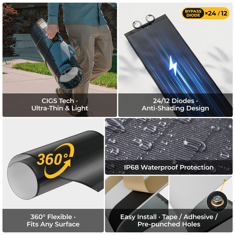 Join the solar revolution with BougeRV's innovative Yuma 100 Watt CIGS Flexible Solar Panel (Rectangle with Adhesive)! Our cutting-edge CIGS solar panels are uniquely designed to flex and adjust to any surface while utilizing CIGS technology to enhance their durability, light sensitivity, and lifespan. Our flexible panels can be easily installed or used as a portable energy solution. Invest in the best and switch to BougeRV CIGS solar panels today!