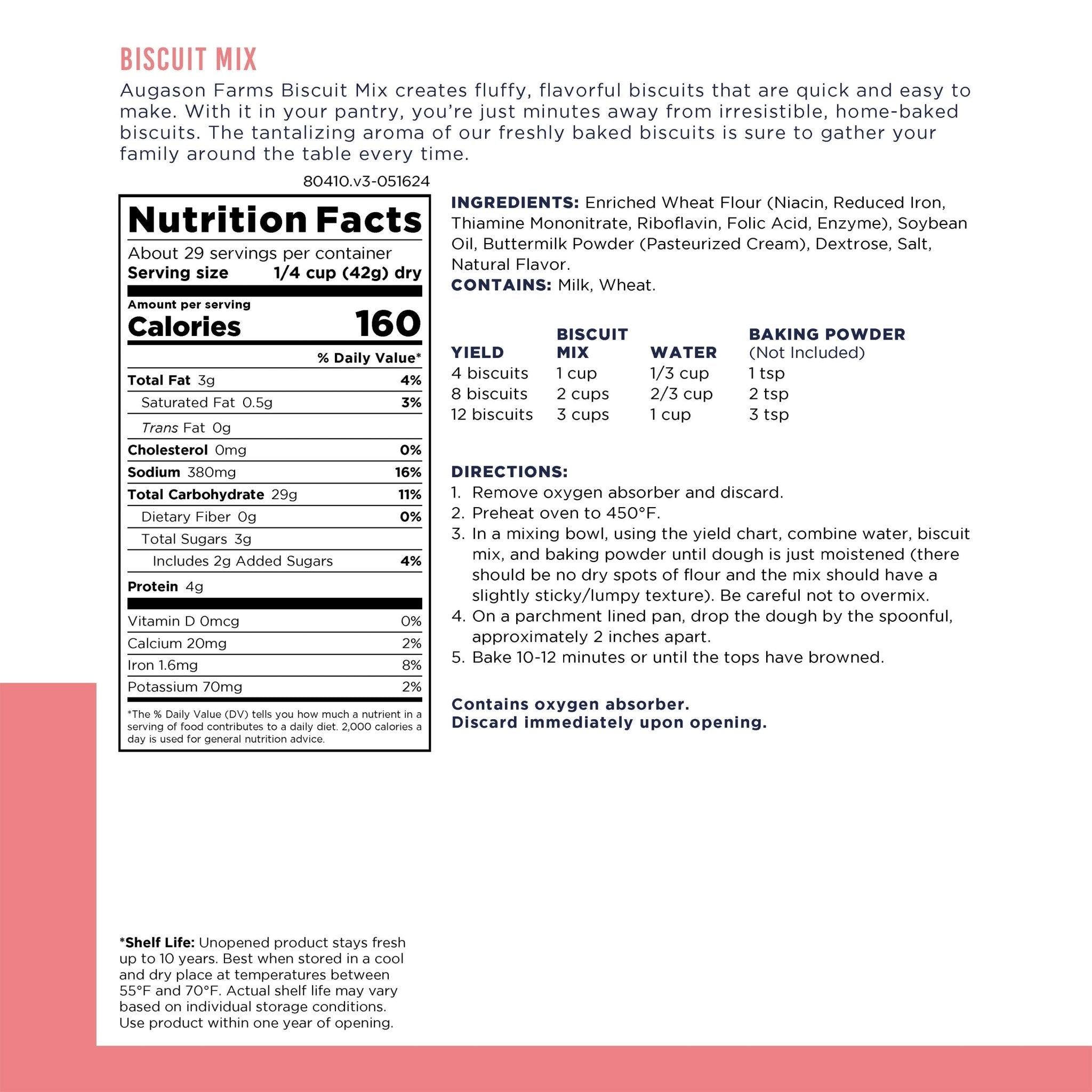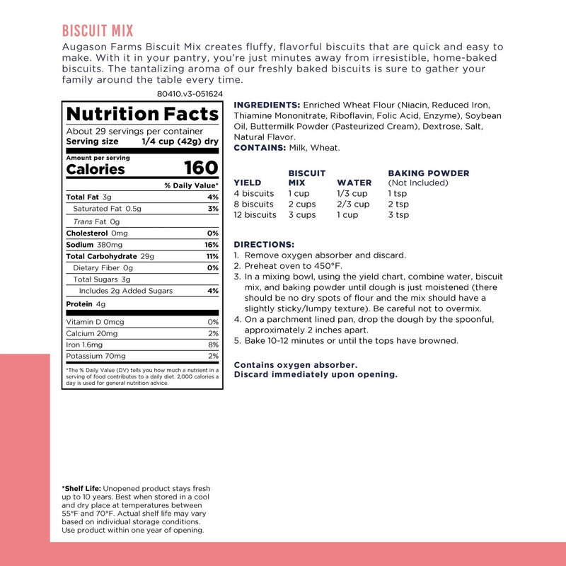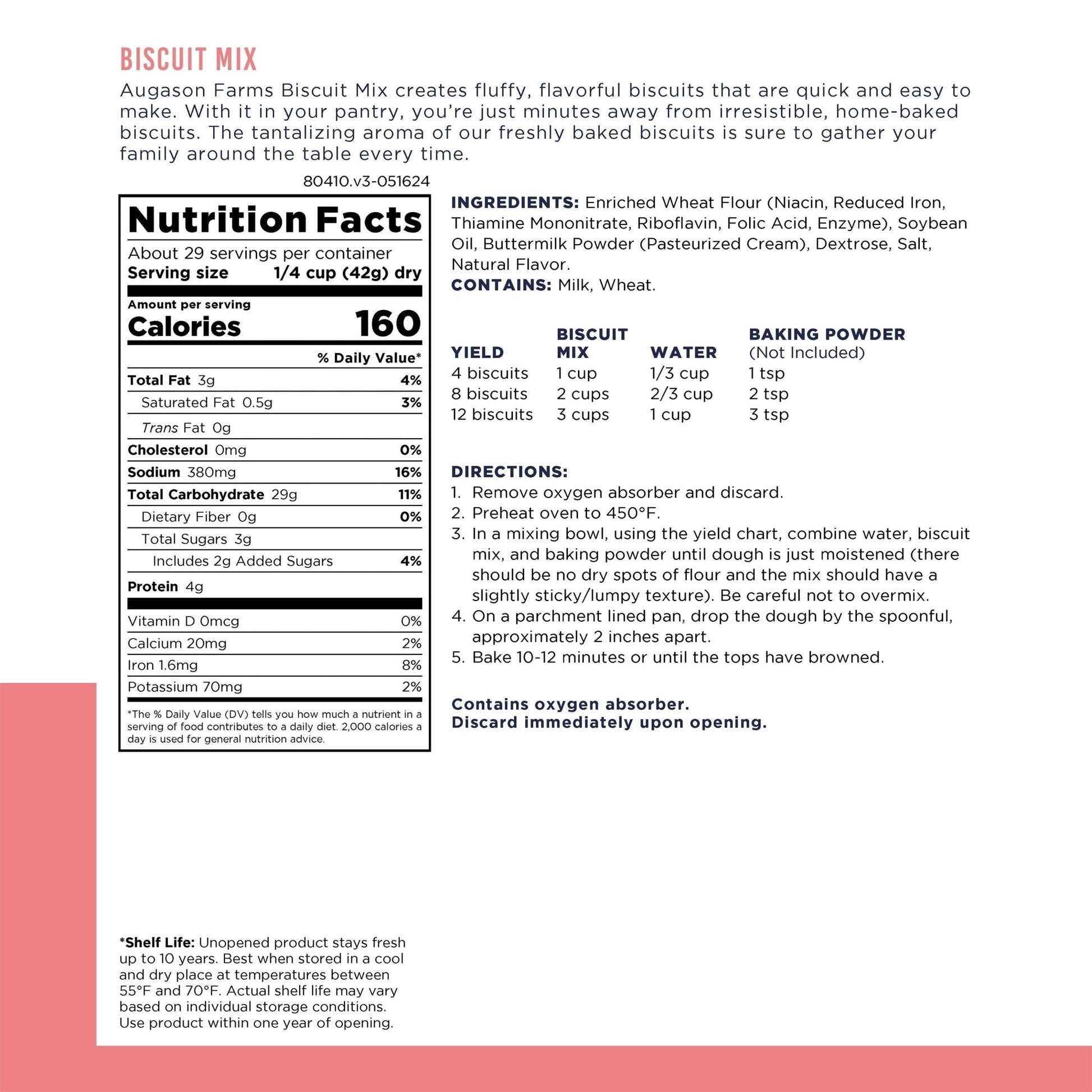 Augason Farms Biscuit Mix is blended from top-quality ingredients for perfect, flaky biscuits every time. Quick and easy to prepare – just add water and baking powder, and bake. This mix is handy for everyday use, as well as for emergency food storage.