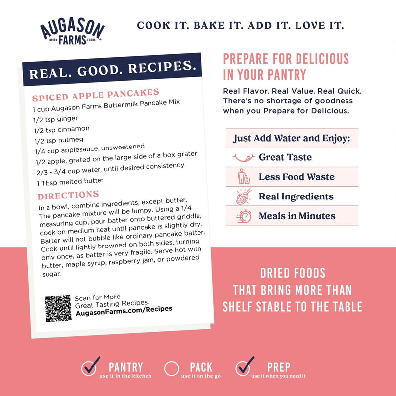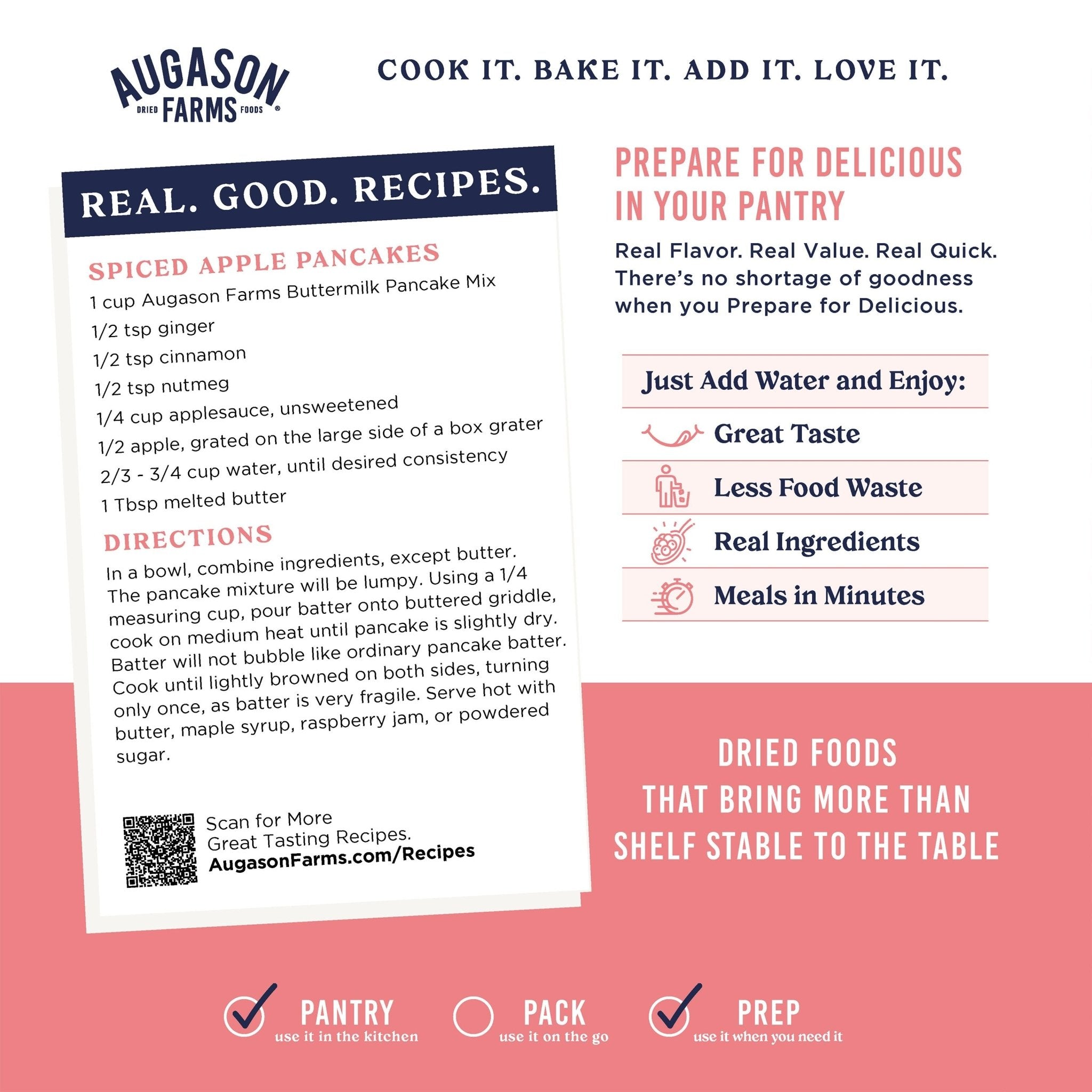 Enjoy Augason Farm’s mouthwatering buttermilk pancakes or waffles at home, on camping trips, or when an emergency calls for a hot plate of comfort food. Just add water to make irresistible pancakes and waffles that rival any pancake mix on the market.