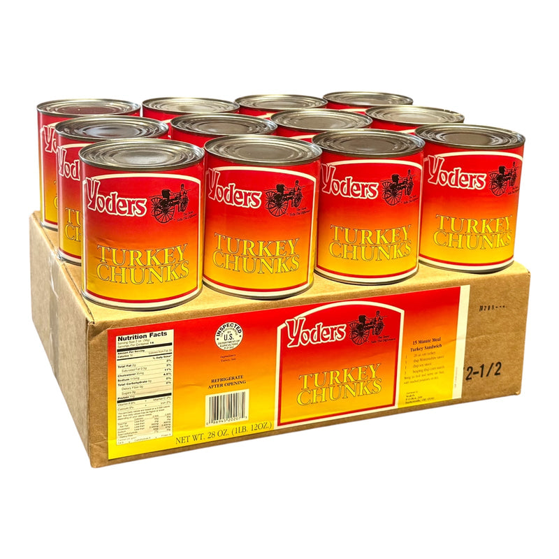 Enjoy the taste, quality, and peace of mind that only Yoder’s Canned Turkey Chunks can provide. Each 28 oz (#2.5) can holds 1¾ pounds of premium, US-raised turkey, fully cooked, tender, and ready to eat straight from the can. That's 21 lbs of fully cooked meat per case! Whether you’re preparing for emergencies, stocking up for camping trips, or building your long term food storage, this shelf-stable turkey is a reliable source of protein you can trust.