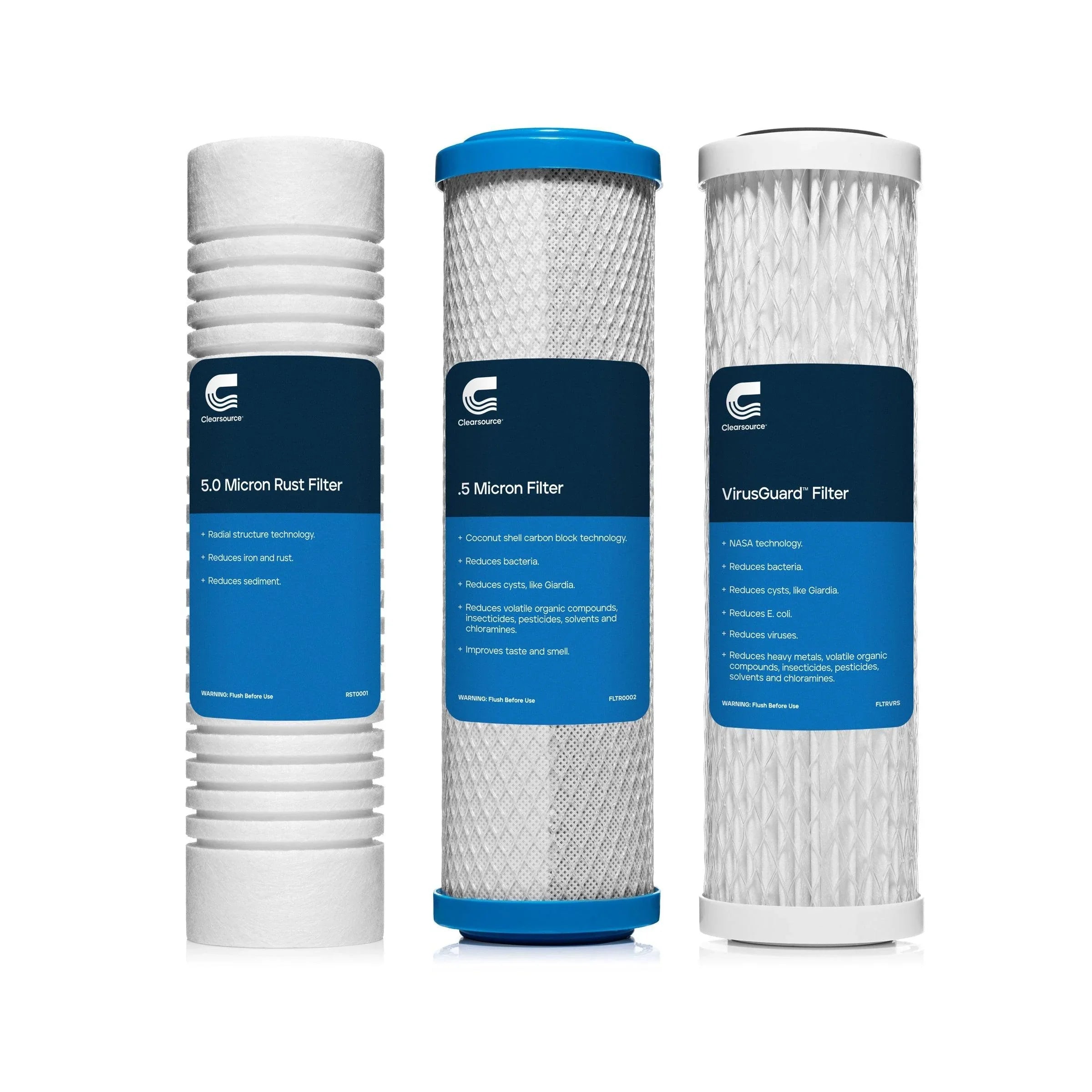 - Includes: One 5.0 micron rust filter, one 0.5 micron carbon block filter, and one VirusGuard filter.