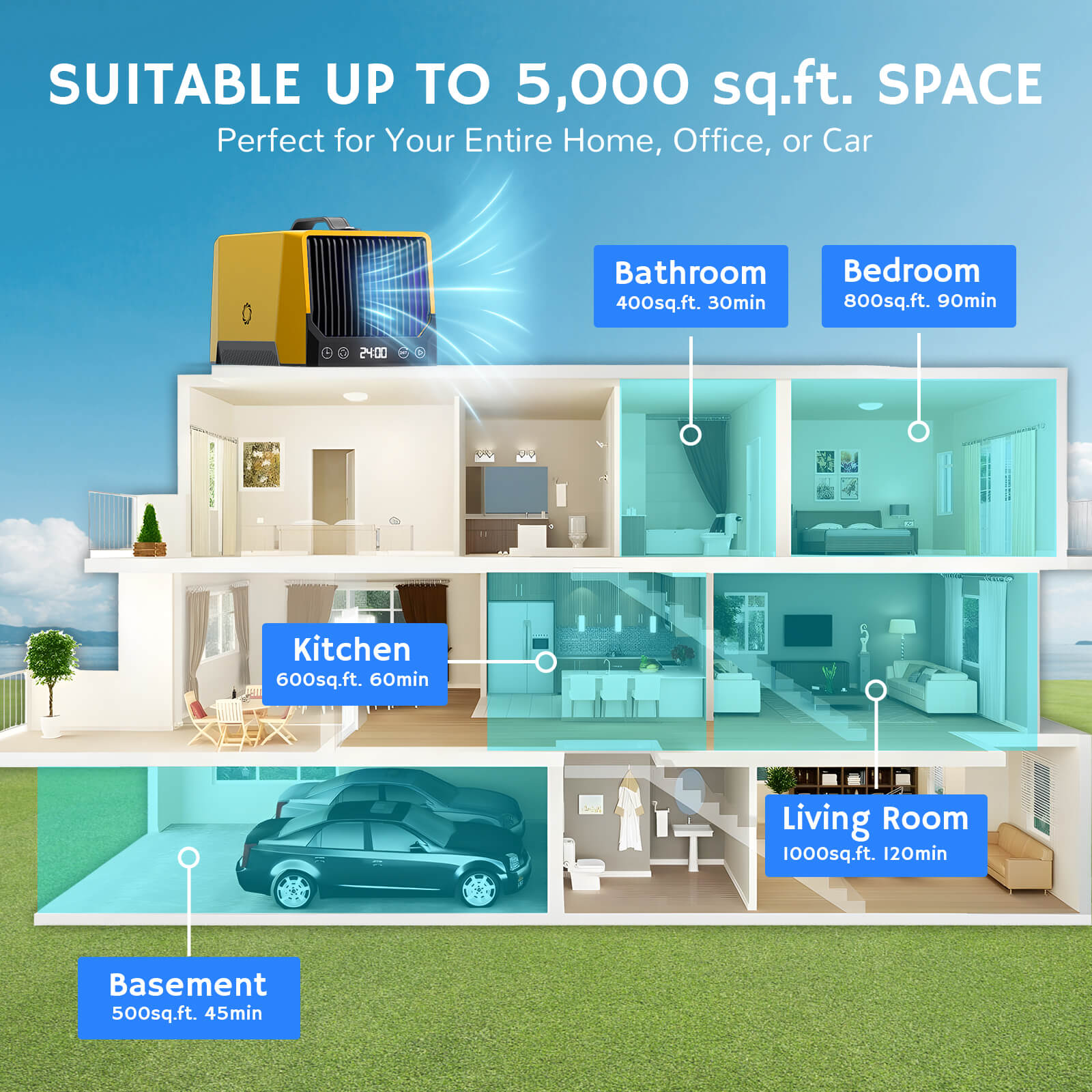 - High Ozone Output: Disinfects air and removes odors, smoke, and pollutants, ideal for large spaces