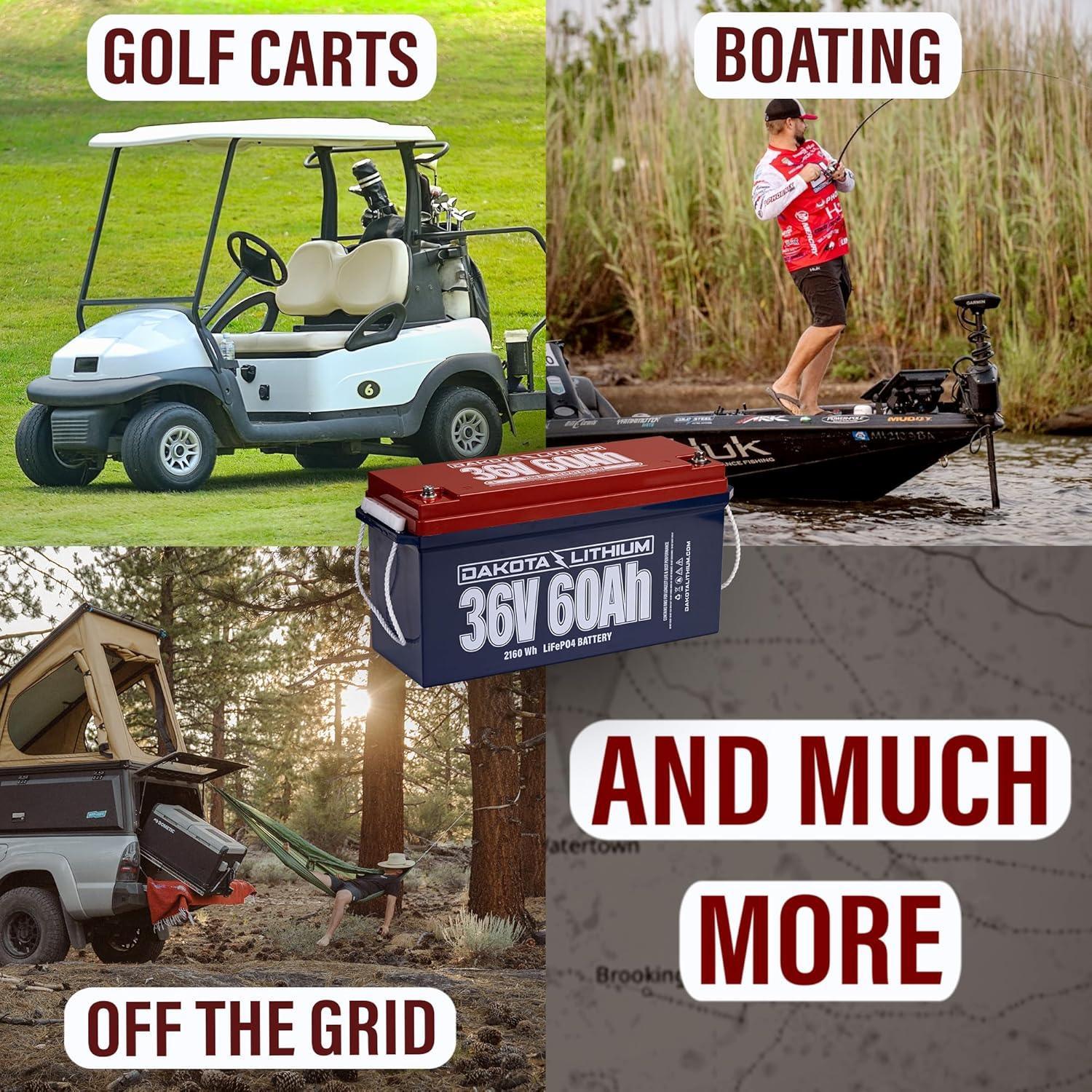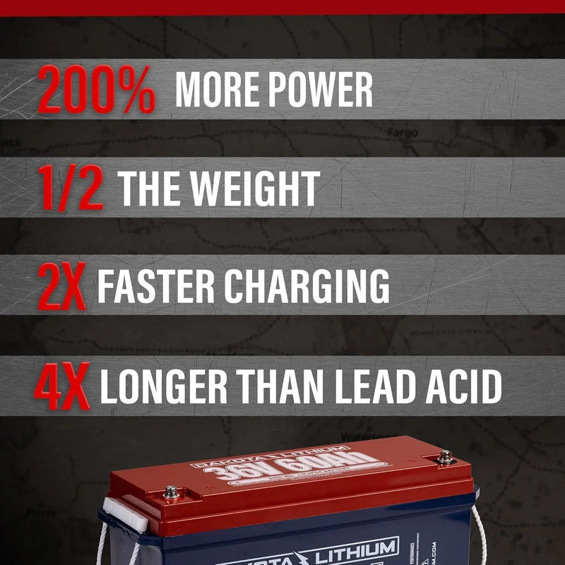 Built Dakota tough with exceptional energy density, this single 36V (volt) 60Ah (amp hour) battery will power your passions from morning to night. Engineered with Lithium Iron Phosphate (LiFePO4) technology this battery has three times the power, one third the weight, and lasts 5 times longer than a set of lead acid batteries providing exceptional lifetime value. 60Ah of capacity is optimal for 36V trolling motors, golf carts and small electric vehicle motors or any 36V deep cycle application in marine or rugged environments where you need lots of power for a long time. This battery is a re-engineered version of DL's legendary 36V 63Ah single lithium battery but with 2X the max power (120A max continuous discharge), 50% longer lifespan, 25% smaller size (volume) and 20% less weight. Built to endure, this extended lifespan battery is backed up by an 11 year warranty. Free 36V 8A LiFePO4 charger included.