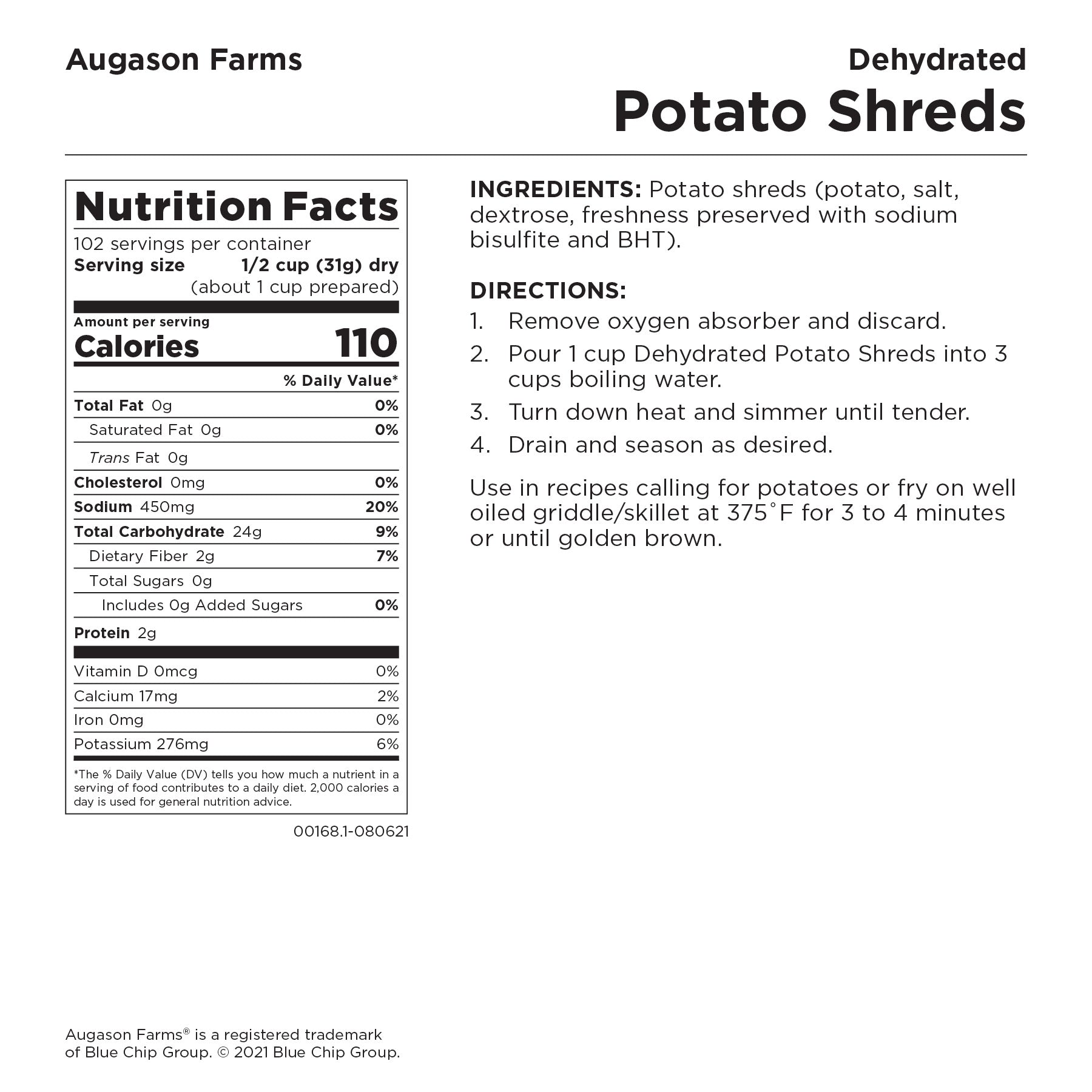 Potato shreds are pre-washed, peeled, shredded, and ideal for hash browns, soups, and casseroles. They are a good source of vitamin C and excellent for use now or as part of your long-term emergency food supply.