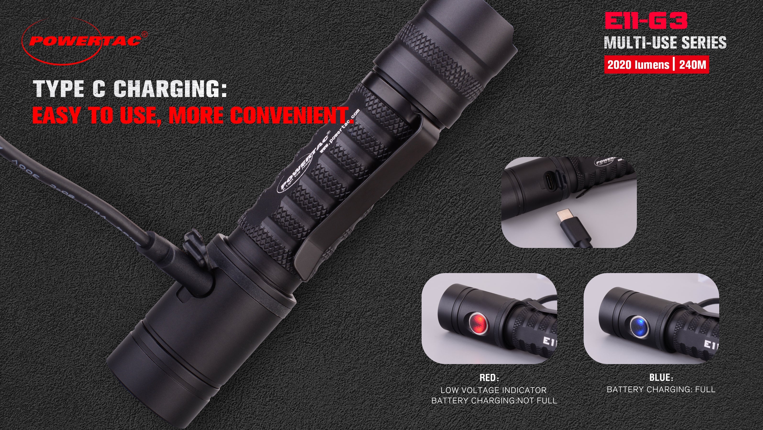 The Powertac E11-G3 is the perfect everyday carry flashlight. With a 2020 max lumen output, handy dual switch interface, and a compact and durable design, this light is the best option for both everyday tasks, professional-grade work, or improving visibility for your next outdoor adventure. This flashlight is ideal for walking down low-lit streets at night or for close-up illumination for activities like reading or completing duties around the house. The E11-G3’s dual switch interface is simple to use and gives instant activation and access to your preferred modes. Feel free to use the tail switch to activate the light and use the side switch for selecting the mode you need. Additionally, the E11-G3’s side switch doubles as an LED monitor for when you're charging the flashlights' 18650 battery pack.