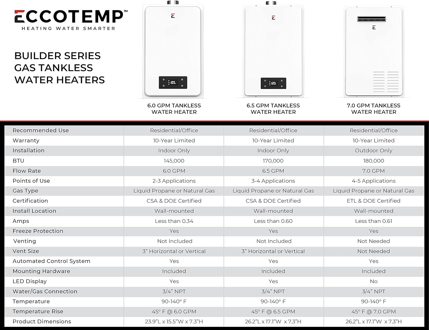 Eccotemp Builder Grade 7.0 GPM Outdoor Liquid Propane Tankless Water Heater Features