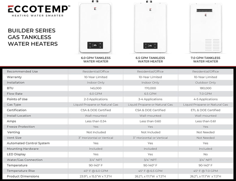 Eccotemp Builder Grade 7.0 GPM Outdoor Liquid Propane Tankless Water Heater Specs