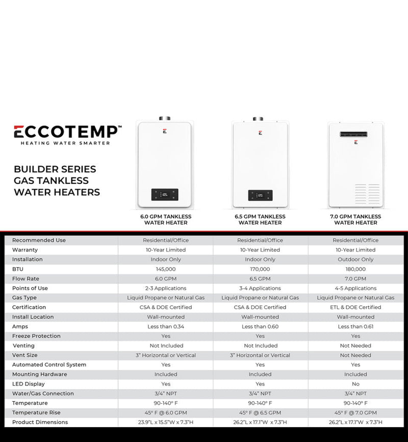 - Eccotemp Builder Series 6 GPM Indoor Tankless Water Heater