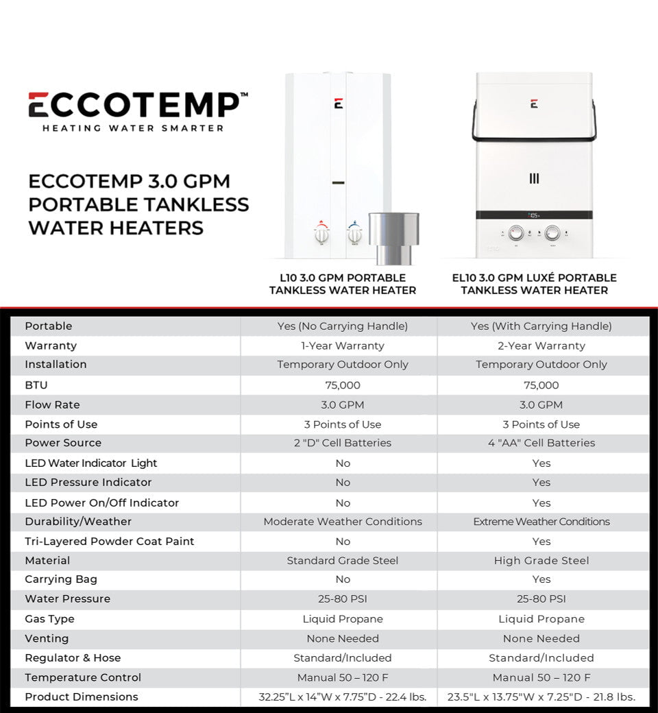 Eccotemp L10 3.0 GPM Portable Outdoor Tankless Water Heater Specs