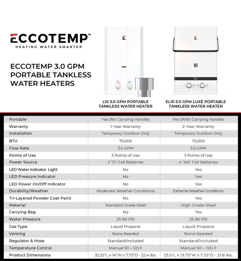 The Eccotemp L10 Outdoor Portable Tankless Water Heater is the number '1' Trusted and Selling portable tankless water heater. With Eccotemp, quality, safety, and affordability are always our number one priority. Enjoy instant, endless hot water anywhere you go, making it perfect for camping, outdoor showers, and emergency preparedness.