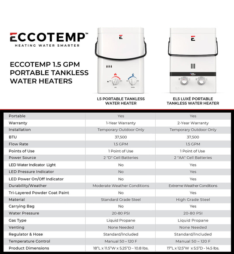Eccotemp Luxé EL5 Portable Outdoor Tankless Water Heater Specs