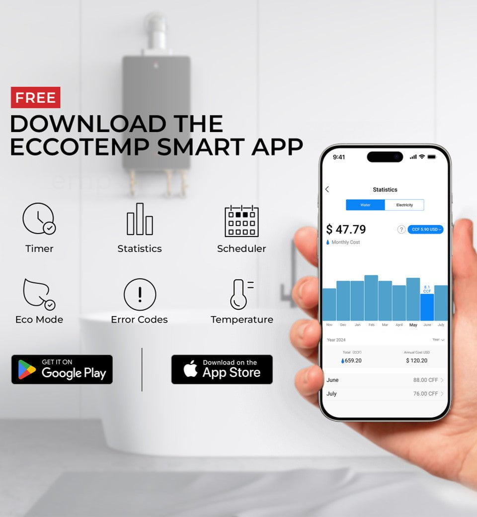The patent pending Eccotemp ESH 2.5 pairs with Amazon Alexa and Google Home to allow smart voice commands such as: “Alexa, turn my Mini up to 110 degrees” or “Hey Google, turn my Mini off.” Use the Eccotemp mobile app to track energy consumption, adjust temperatures or even detect product and network errors. Want to know the actual energy cost when using the Eccotemp ESH SMARTHOME Mini Tank Water Heater? Our mobile app allows you to see real consumption statistics with an associated dollar amount.