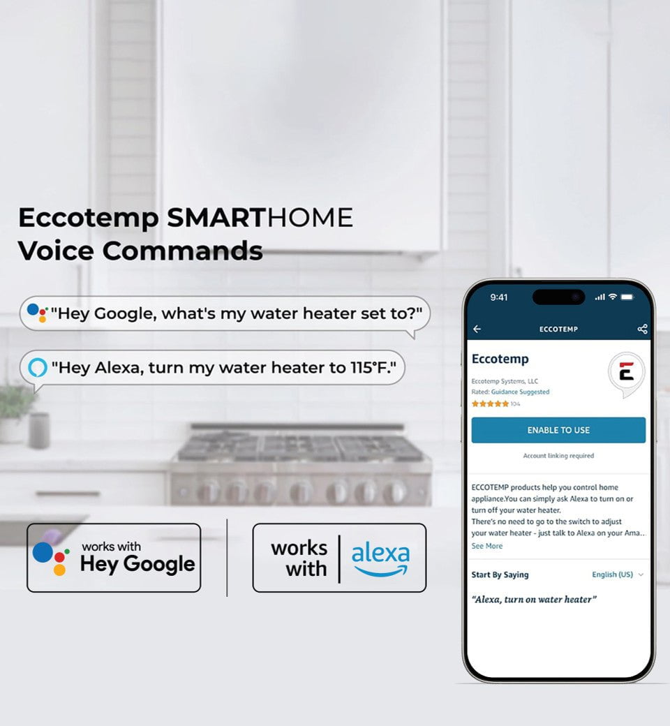 Patent pending, SMARTHOME ready, compatible with Amazon Alexa and Google Assistant. The Eccotemp SMARTHOME app allows you to adjust temperatures, turn your mini on/off and access to advanced energy usage statistics using advanced voice controls.