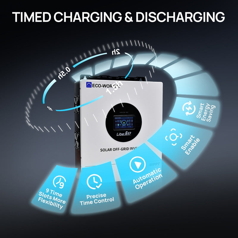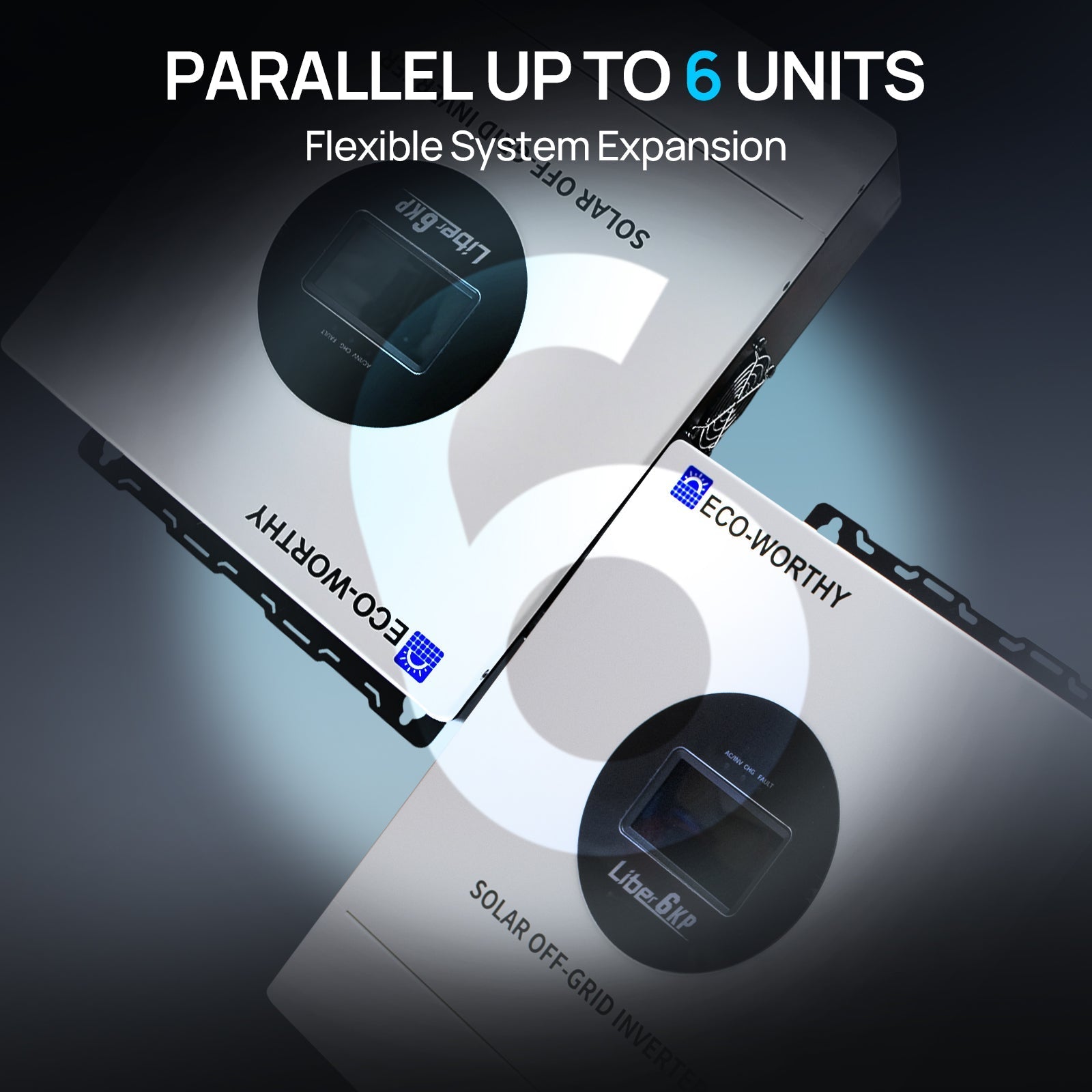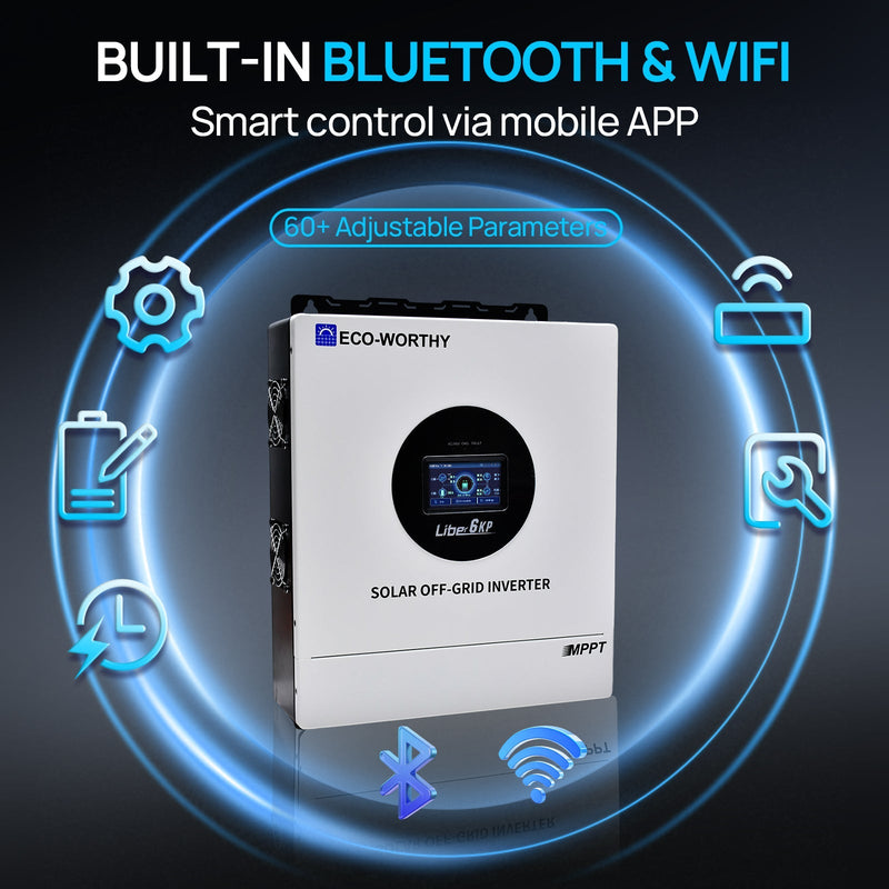 Power your off-grid home, cabin, shop, or backup power system with the high-performance 6kW Off-Grid Split-Phase All-in-One (AIO) Inverter. Engineered for reliability, efficiency, and heavy-duty performance, this inverter delivers 6000W continuous power and up to 12,000W peak power, making it ideal for demanding appliances, motors, and whole-home off-grid systems.