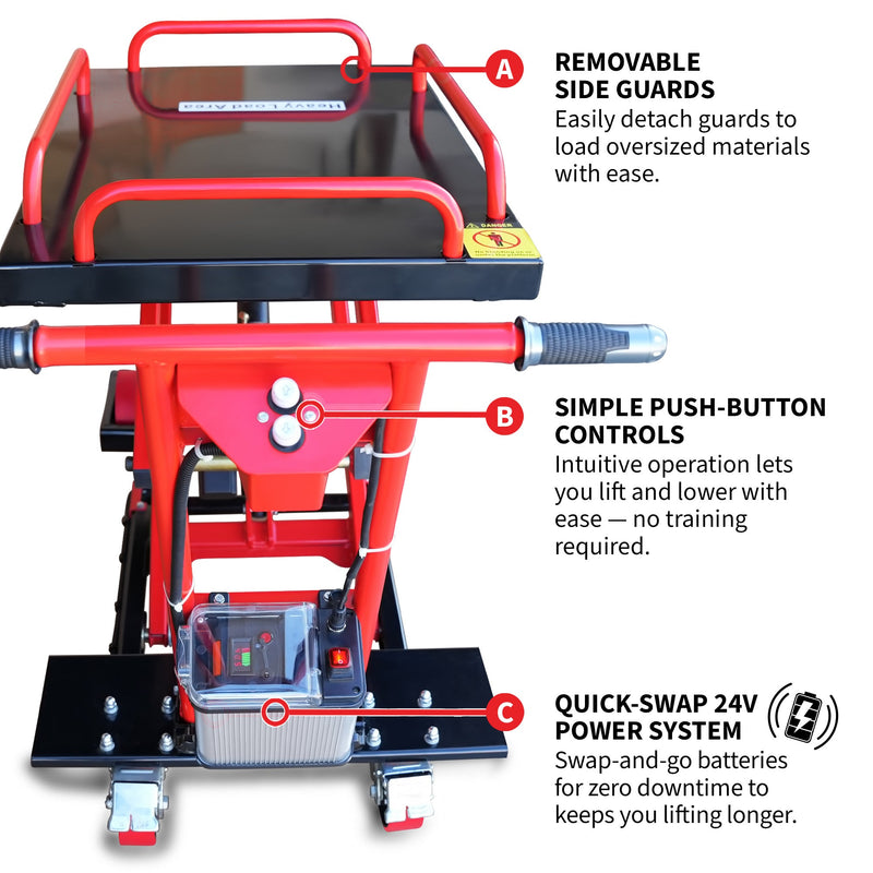 This electric hydraulic lift cart raises and lowers smoothly for safe, consistent handling.