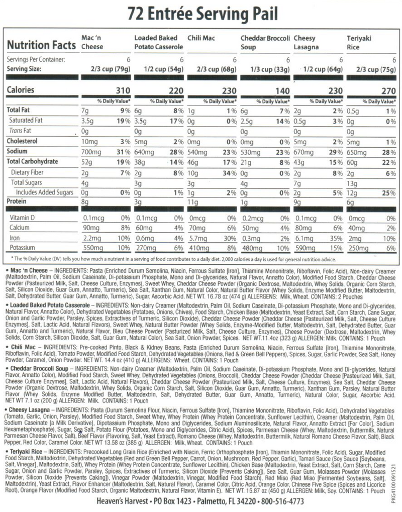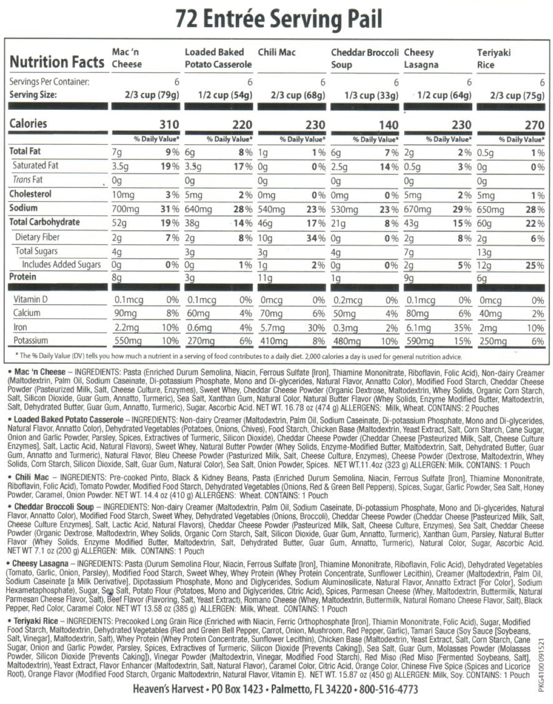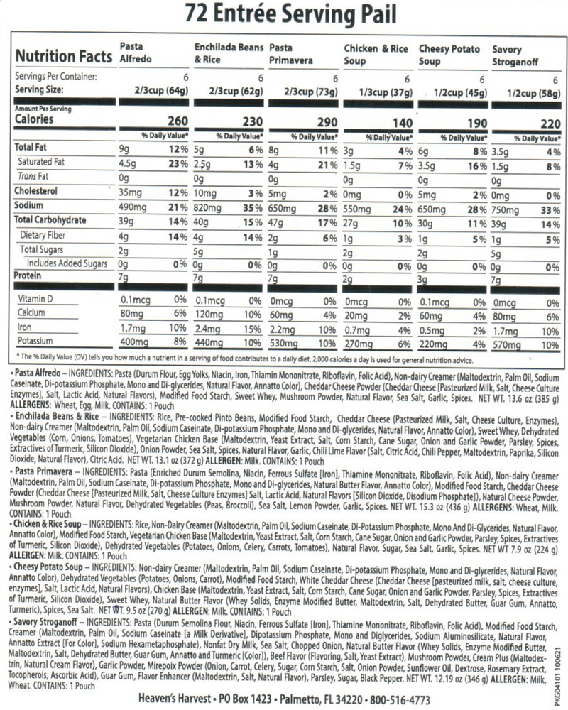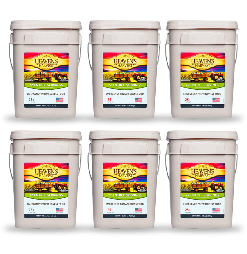 Heaven's Harvest Survival Entrèe Kit should be the foundational building blocks of your food storage. This bucket is packed with 72 servings of nutritious, hardy, calorie-packed entrèes; which will make up the main courses of your daily meal plan.