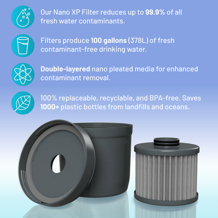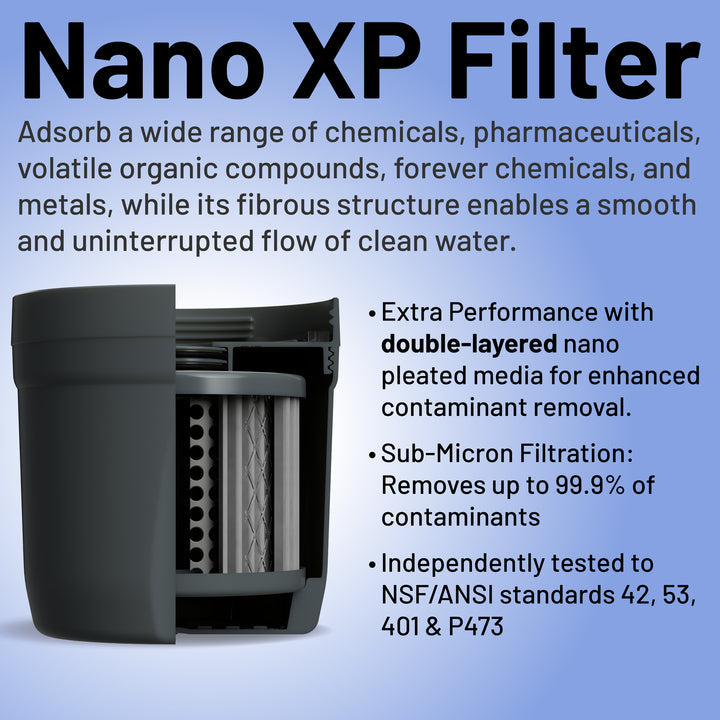 The Nano XP Filter is our most advanced design yet, featuring double-layer nano pleated media for twice the surface area and a 30% faster flow rate. Independently tested to NSF/ANSI Standards 42, 53, 401, P231, and P473, it removes over 70+ contaminants including PFAS, lead, pharmaceuticals, bacteria, viruses, and microplastics. This filter is NSF CERTIFIED to standard 42 and produces up to 100 gallons of clean water (about 3–4 months), making it ideal for everyday use, well water, camping, or emergency situations.