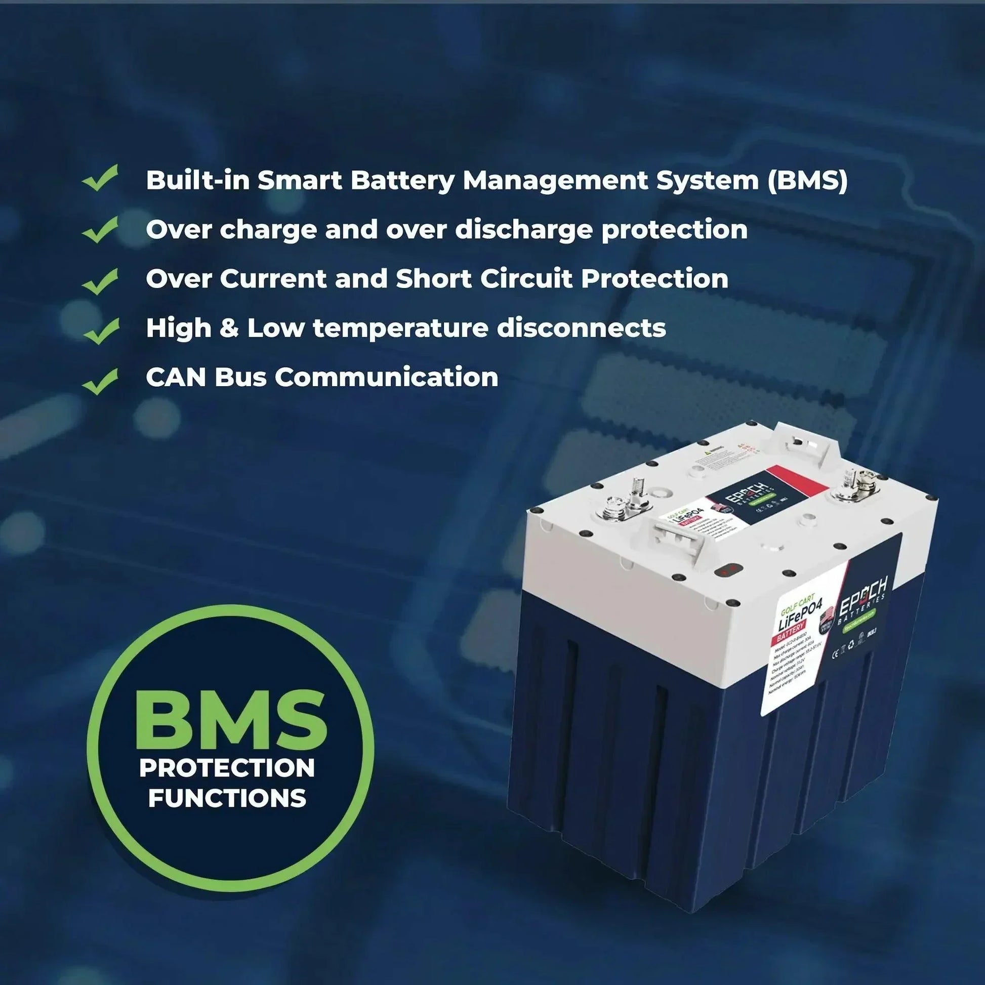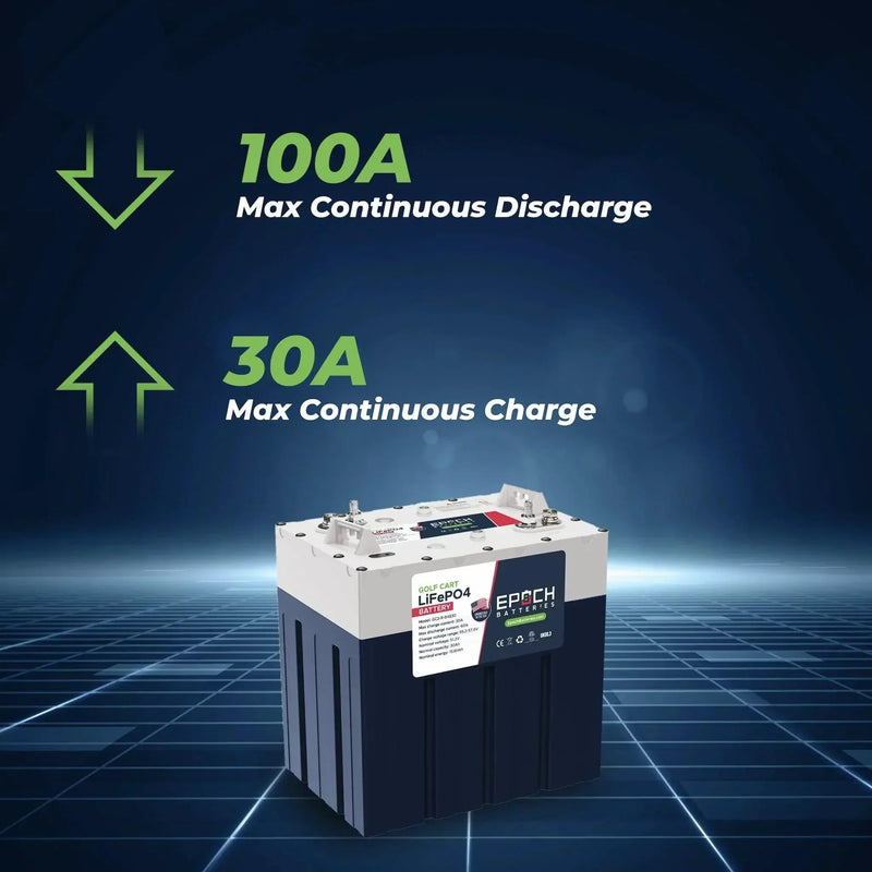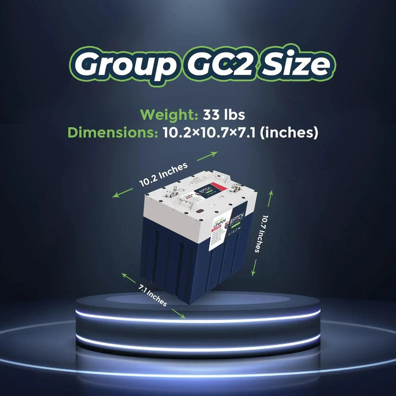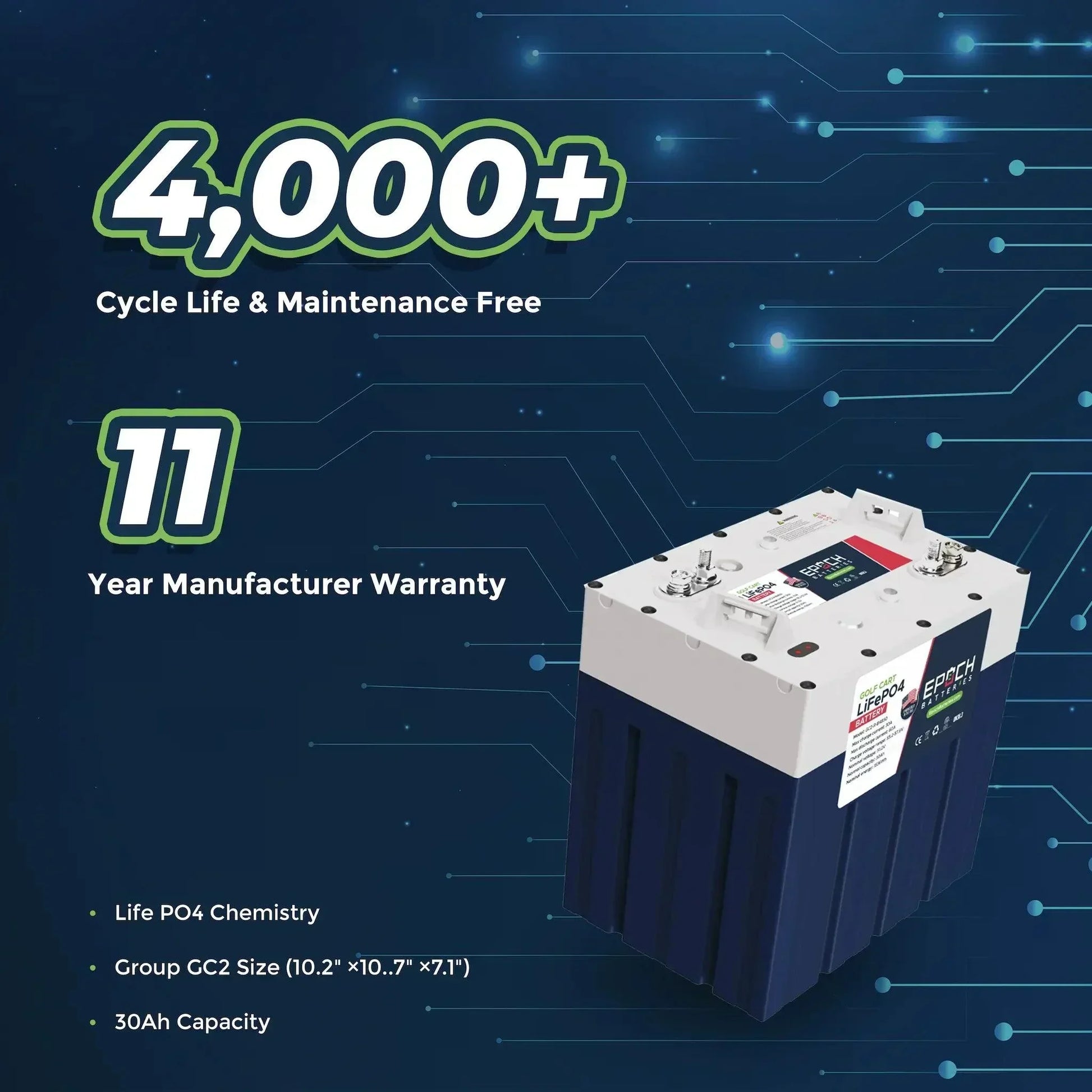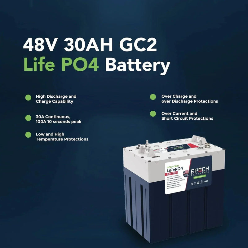 Epoch 48V 30Ah GC2 LiFePO4 Lithium Golf Cart Battery: Drop-in power upgrade for your golf cart! Ditch heavy lead-acid batteries and experience incredible range, fast charging, and zero maintenance. ⚡️ Enjoy extended lifespan, safer operation, and lighter weight for a smoother ride. All in a compact GC2 size, ready to transform your cart!