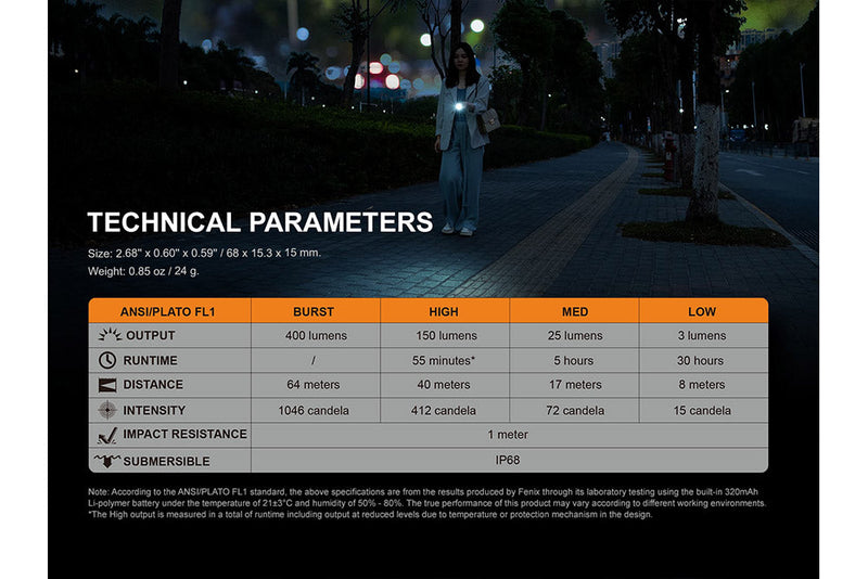 The Fenix E05R flashlight offers a rechargeable 320mAh Li-polymer battery capable of emitting up to 400 lumens. It can run for up to 30 hours with a built-in micro USB charging port. The flashlight is IP68 dust-proof and waterproof-rated for durability and compact enough to carry on a keychain.