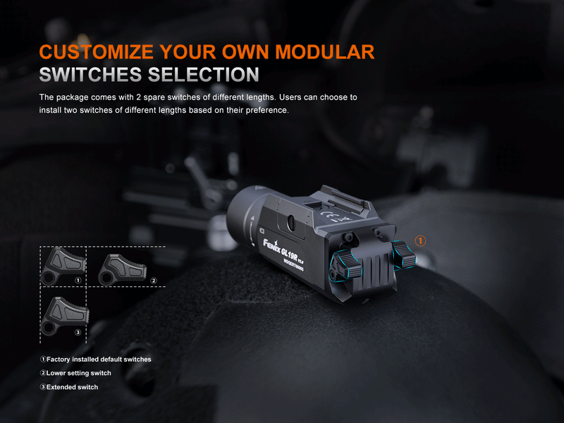 The Fenix GL19R is a premium tactical flashlight engineered for reliability, versatility, and power. Featuring an ultra-high intensity 44,300 candela beam and a maximum output of 1200 lumens, this compact light can illuminate up to 1378 feet, making it perfect for professional use. Its innovative modular switches allow users to customize the activation style. The se ambidextrous mechanical rear switches provide both momentary-on and instant activation options, ensuring seamless operation for both right- and left-handed users.