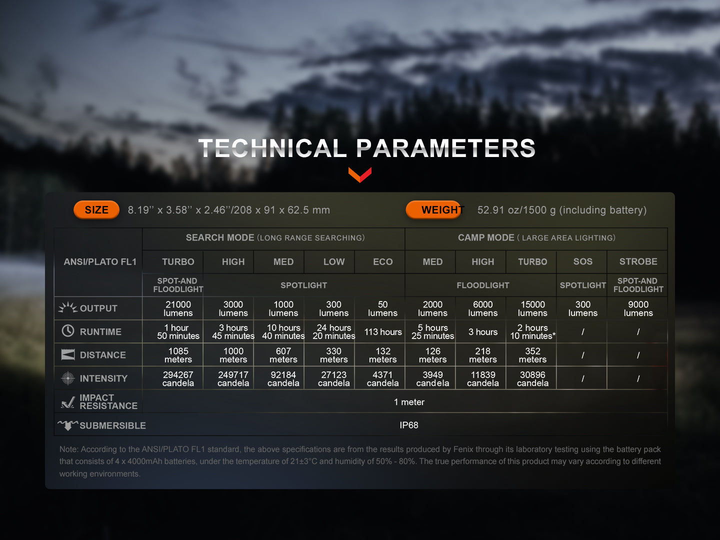 The Fenix LR60R redefines the boundaries of flashlight capabilities, boasting an awe-inspiring 21,000 lumens and 294,267 candela maximum output generating a beam distance of 3,560 ft (1085 meters). This high-end torch features an OLED smart display, a unique addition that informs you of the runtime, output, and battery percentage.