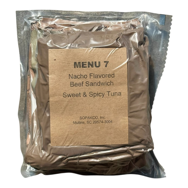 Beef Nacho Sandwich; Tuna Sweet & Spicy; Blueberry Turnover; Tortillas; Spread Cheddar Potato Bacon; Crackers; Baked Snack Crackers, Hot & Spicy; Beef Stick Teriyaki; First Strike Bar, Chocolate; First Strike Bar, Apple Cinnamon; Nut Fruit Mix; Zapplesauce; Beverage Base x 2 Caffeinated gum, cinnamon; Mayonnaise fat free; Accessory packet |